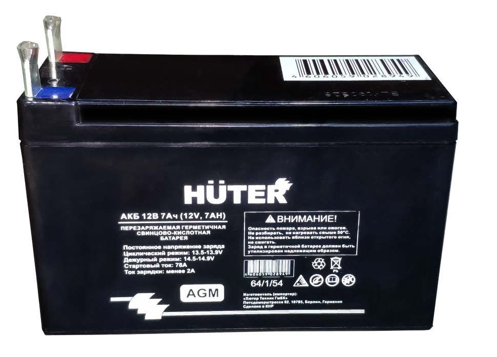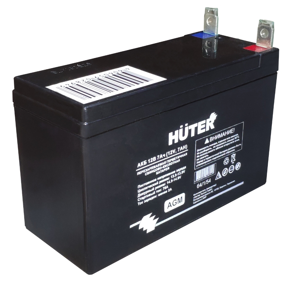 Аккумуляторные батареи свинцово-кислотные, герметичные. Предназначены для запуска бензиновых электрогенераторов, оснащённых электрическим стартером. Могут применяться, так же, и для другой бензиновой техники со схожими техническими параметрами. Аккумуляторы HUTER изготовлены при помощи технологии AGM (Absorbent Glass Mat). Отличие батарей AGM от классических в том, что в них содержится абсорбированный электролит, а не жидкий, что даёт ряд преимуществ в свойствах аккумулятора: Напряжение аккумулятора: 12, В Ёмкость аккумулятора: 12, А*ч 1) Не требуют обслуживания. 2) Значительно меньший саморазряд. 3) До 2,5 раз большая скорость заряда. 4) Способность хорошо принимать заряд. 5) Не чувствительны к кратковременному «глубокому» разряду. 6) Конструкция герметизированная, что предотвращает утечку кислоты и коррозию клемм. 7) Более безопасная работа: при правильной зарядке батарей исключается возможность выделения газов и опасность взрыва. 8) Герметизированная конструкция позволяет устанавливать батарею почти в любом положении (вверх дном не рекомендуется). 9) Уверенная работа при низких температурах. 10) Увеличенный срок службы в условиях повышенной вибрации. В ассортименте компании 2 варианта батарей: АКБ 12В 7Ач Huter для генераторов DY3000LX, DY4000LX и аналогичных. АКБ 12В 12Ач Huter для генераторов DY6500LX/LXA/LXW, DY8000LX/LXA/LX-3, DY9500LX/LX-3 и аналогичных.