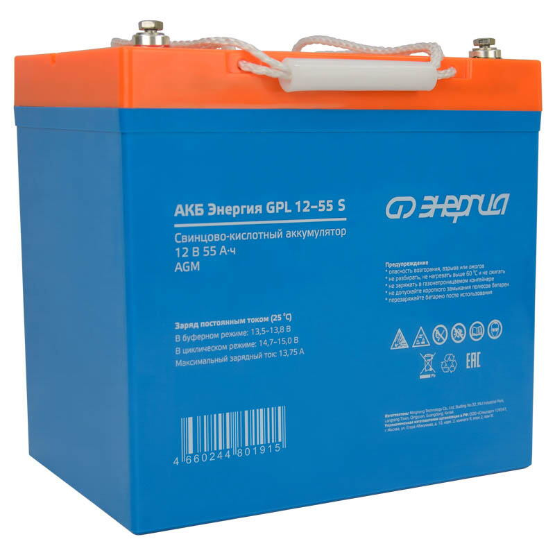 АКБ Энергия GPL 12-55 S - это герметичный свинцово-кислотный аккумулятор, изготовленный по технологии AGM, имеет емкость 55 Ач и напряжение 12 В. Подходит для широкого спектра применений, включая: бесперебойная работа систем безопасности, питание электроприборов, сигнализаций, медицинского оборудования, уличного и аварийного освещения. Форма напряжения от АКБ: Чистая синусоида Максимальный ток заряда (А): 13.75 Материал корпуса: abs-пластик Величина постоянного напряжения АКБ (В): 12 Подключение аккумулятора к инвертору: Клеммы Рабочая температура, °С: -20+50 Цвет корпуса: голубой Емкость (Ач): 55 Максимальный ток разряда, А (5 сек): 550 Тип клемм: T14 (M6×16) Заряд (циклический режим): от 14,7 до 15В при 25⁰С Заряд (буферный режим): от 13,5 до 13,8В при 25⁰С Срок службы в буферном режиме (25⁰С): 12 лет Вес нетто (кг): 16,5 Габаритные размеры нетто (мм): 215х138х228 Вес брутто (кг): 17,0 Преимущества: Большая емкость - 55 Ач, что позволяет аккумулятору питать подключенное устройство в течение более длительного времени. Низкий саморазряд - 3% в месяц при 25 °С. Не требует обслуживания - аккумулятор не требует доливки электролита или других работ по обслуживанию. Герметичная конструкция - предотвращает утечку электролита. Устойчивость к глубоким разрядам - позволяет аккумулятору работать даже после глубокого разряда. Длительный срок службы - аккумулятор может прослужить до 12 лет при правильном использовании.