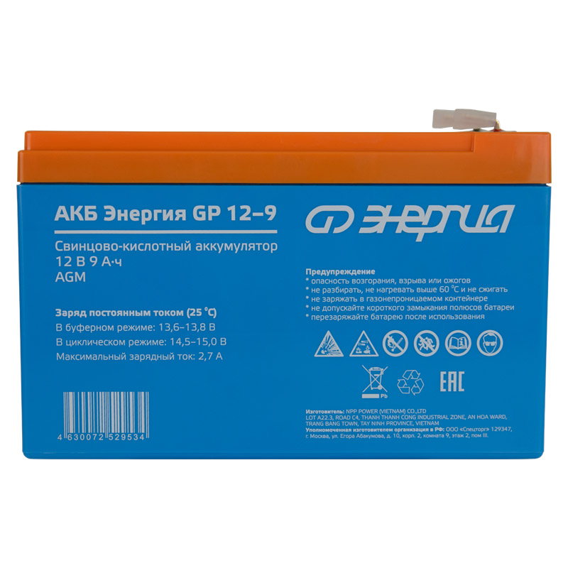 АКБ Энергия GP 12-9 - это аккумуляторная батарея, созданная по технологии AGM. Она идеально подходит для буферного режима работы в различных устройствах, которым требуется непрерывное электроснабжение. Среди таких устройств - системы бесперебойного питания, охраны и пожаротушения, информации и телекоммуникации и другие виды оборудования. Емкость (Ач): 9 Напряжение батареи (В): 12 Тип батареи: AGM Максимальный ток заряда (А): 2.7 Максимальный ток разряда, А (5 сек): 135 Внутреннее сопротивление (милиОм): 19 Тип клемм: Т2 (под разъём F6.3) Срок службы в буферном режиме (25⁰С): 6 лет Материал корпуса: ABS-пластик Условия эксплуатации (⁰С): -15...+50 Вес нетто (кг): 2,6 Габаритные размеры (мм): 151x65x100 Вес брутто (кг): 2,6 Аккумуляторная батарея должна эксплуатироваться совместно с источником бесперебойного питания, обеспечивающим преобразование напряжения на клеммах батареи в напряжение питания подключенных устройств к заряду батареи после разряда и компенсации саморазряда. Раз в 3 месяца рекомендуется производить полный разряд батареи (при помощи ИБП по индикатору заряда батареи) и полный заряд батареи. Если АКБ не эксплуатируется, то минимум 2 раза в год необходимо производить цикл полного разряда и последующего полного заряда. Особенности Диапазон рабочих температур: разряд 15...+50С; заряд 10...+50С; хранение 20...+50С Диапазон зарядного напряжения в буферном режиме (25 С) 13,613,8 В Диапазон зарядного напряжения в циклическом режиме (25 С) 14,515,0 В Герметичная конструкция, предотвращающая утечку кислоты Можно использовать в жилых помещениях Не требуют дополнительного обслуживания Стабильная работа при больших нагрузках Устойчивость к разряду ниже 40% Низкий саморазряд - 3% в месяц при 25 °С Cтрана производства: Вьетнам