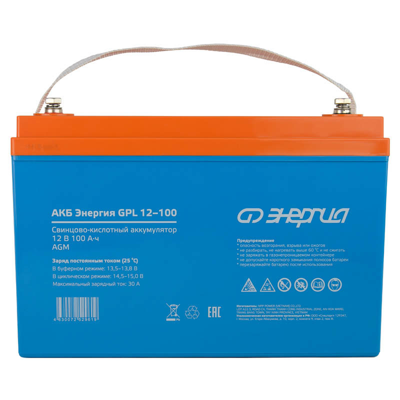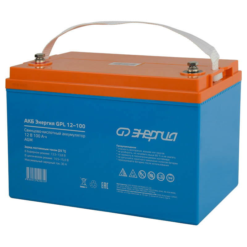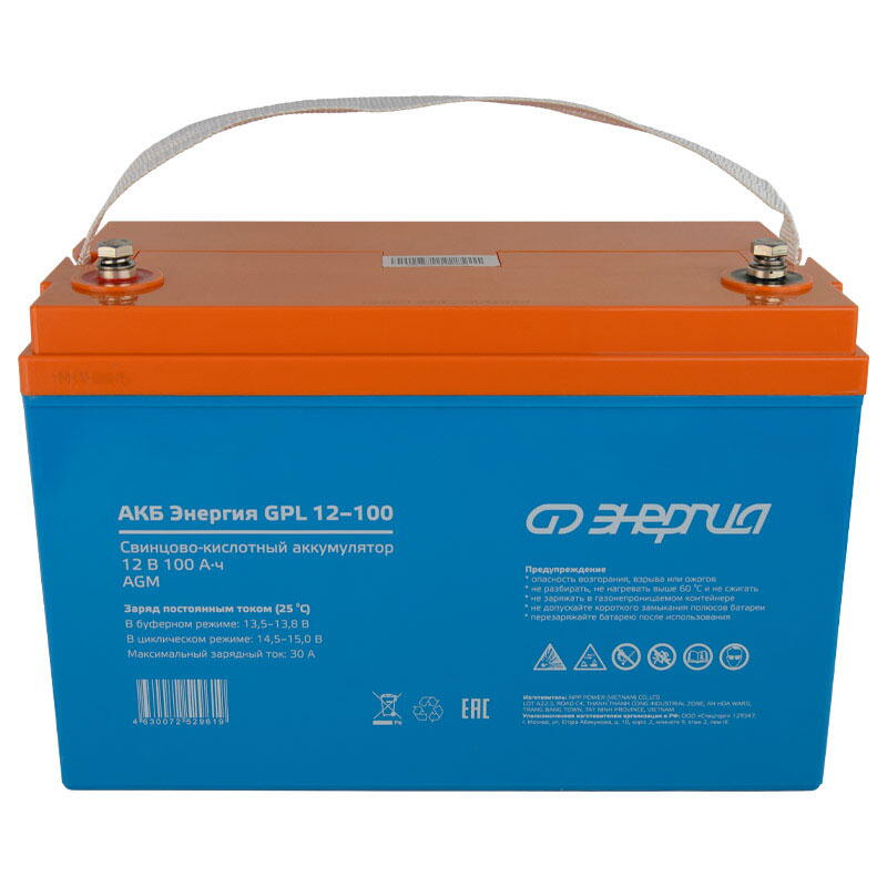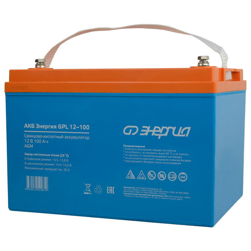 АКБ Энергия GPL 12-100 - это аккумуляторная батарея, созданная по технологии AGM. Она идеально подходит для буферного режима работы в различных устройствах, которым требуется непрерывное электроснабжение. Среди таких устройств - системы бесперебойного питания, охраны и пожаротушения, информации и телекоммуникации и другие виды оборудования. Емкость (Ач): 100 Напряжение батареи (В): 12 Тип батареи: AGM Максимальный ток заряда (А): 30 Максимальный ток разряда, А (5 сек): 800 Тип клемм: T14 (M6×16) Заряд (циклический режим): от 14,5 до 15В при 25⁰С Заряд (буферный режим): от 13,5 до 13,8В при 25⁰С Срок службы в буферном режиме (25⁰С): 12 лет Материал корпуса: ABS-пластик Условия эксплуатации (⁰С): -15...+50 Вес нетто (кг): 29,3 Габаритные размеры (мм): 330х171х220 Вес брутто (кг): 30 Аккумуляторная батарея должна эксплуатироваться совместно с источником бесперебойного питания, обеспечивающим преобразование напряжения на клеммах батареи в напряжение питания. Если АКБ не эксплуатируется, то минимум 2 раза в год необходимо производить цикл полного разряда и последующего полного заряда. Особенности Диапазон рабочих температур: разряд 15...+50С; заряд 10...+50С; хранение 20...+50С Диапазон зарядного напряжения в буферном режиме (25 С) 13,613,8 В Диапазон зарядного напряжения в циклическом режиме (25 С) 14,515,0 В Герметичная конструкция, предотвращающая утечку кислоты Можно использовать в жилых помещениях Не требуют дополнительного обслуживания Стабильная работа при больших нагрузках Устойчивость к разряду ниже 40% Низкий саморазряд - 3% в месяц при 25 °С Cтрана производства: Вьетнам