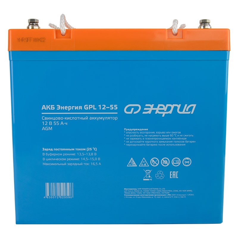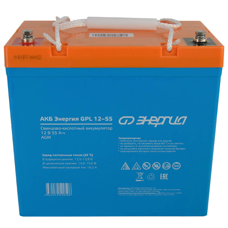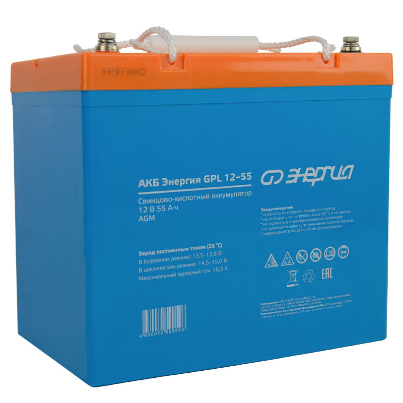 АКБ Энергия GPL 12-55 - это аккумуляторная батарея, созданная по технологии AGM. Она идеально подходит для буферного режима работы в различных устройствах, которым требуется непрерывное электроснабжение. Среди таких устройств - системы бесперебойного питания, охраны и пожаротушения, информации и телекоммуникации и другие виды оборудования. Название модели: Аккумулятор Энергия АКБ 12-55 GPL Артикул: Е0201-0059 Емкость Ач: 55 Напряжение батареи: 12В Тип батареи: AGM Максимальный ток заряда, А: 16.5 Максимальный ток разряда, А (5 сек): 550 Тип клемм: T14 (M6×16) Диапазон зарядного напряжения в циклическом режиме от 14,5 до 15В при 25⁰С Диапазон зарядного напряжения в буферном режиме от 13,5 до 13,8В при 25⁰С Саморазряд при 25°С, % емкости в месяц: 3 Расчетный срок службы в буферном режиме (20⁰С): 12 лет Материал корпуса: ABS пластик Условия эксплуатации от -10 до +50 Вес, кг: 17,3 ± 5% Аккумуляторная батарея должна эксплуатироваться совместно с источником бесперебойного питания, обеспечивающим преобразование напряжения на клеммах батареи в напряжение питания подключенных устройств к заряду батареи после разряда и компенсации саморазряда. Раз в 3 месяца рекомендуется производить полный разряд батареи (при помощи ИБП по индикатору заряда батареи) и полный заряд батареи. Если аккумуляторная батарея не эксплуатируется, то минимум 2 раза в год необходимо производить цикл полного разряда и последующего полного заряда.