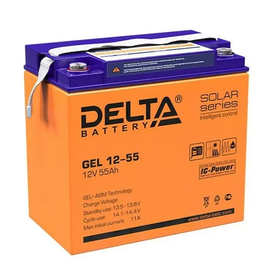 Краткое описание Свинцово-кислотный аккумулятор Delta GEL 12-55 напряжением 12В и емкостью 55Ач изготовлен по технологии AGM+GEL: combined AGM and GEL technology (частичное сгущение электролита). Устойчив к глубоким разрядам. Дополнительно аккумулятор оснащен LCD дисплеем, отображающем различные статусы работы аккумулятора. Корпус изготовлен из негорючего ABS пластика. Срок службы аккумулятора достигает 10-12 лет. Аккумулятор предназначен для работы в режиме постоянного подзаряда (буферный режим) или в режиме разряд-заряд (циклический режим). Обладает низким внутренним сопротивлением и саморазрядом. Дополнительно к аккумулятору у нас можно подобрать зарядное устройство для него, батарейный шкаф или стеллаж. Технические характеристики Номинальное напряжение 12 В Число элементов 6 Срок службы 10-12 лет Номинальная емкость (25oС) 10 часовой разряд (5.5 А; 1.8 В/эл) 55 Ач 5 часовой разряд (9.05 А; 1.75 В/эл) 45.25 Ач 1 часовой разряд (34.5 А; 1.65 В/эл) 34.5 Ач Саморазряд 3% емкости в месяц при 20oС Внутреннее сопротивление полностью заряженной батареи (25oС) 6 мОм Особенности Продолжительный срок службы; Технология AGM+GEL; Устойчивость к глубоким разрядам; Температурная стабильность характеристик; Исключены утечки кислоты, гарантирована безопасная эксплуатация с другим оборудованием; Отсутствует газовыделение, достаточно естественной вентиляции; Нет необходимости в контроле уровня и доливе воды; Корпус аккумулятора выполнен из пластика ABS, не поддерживающего горение. Рабочий диапазон температур Разряд -20÷60 Заряд -10÷60 Хранение -20÷60 Макс. разрядный ток (25oС) 550 А (5с) Циклический режим (2.3÷2.35 В/эл) Макс.зарядный ток 11 А Температурная компенсация 30 мВ/oС Буферный режим (2.23÷2.27 В/эл) Температурная компенсация 20 мВ/oС Габариты (±1мм) Длина, мм228 Ширина, мм 137 Высота, мм 214 Полная высота, мм 214 Вес (±3%), кг 16.7