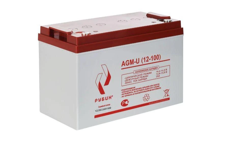 Свинцово-кислотные AGM аккумуляторы РУБИН используют передовую технологию абсорбированного стекловолокном электролита, которая позволяет достичь высокой энергоемкости и надежности. Прочный корпус из ABS пластика, система рекомбинации газов и защитные клапана экстренного сброса давления (VRLA) значительно увеличивают срок службы и делает их более безопасными и долговечными. В AGM аккумуляторах РУБИН используются передовые материалы, которые придают аккумуляторам высокую стойкость к циклическому заряду и разряду, что значительно увеличивает их срок службы и дополнительно обеспечивают высокую производительность в любых условиях. Аккумуляторы обладают низким саморазрядом (до 3%). Рабочее напряжение 12 V. Оборудование присоединяется к аккумуляторам болтами М8, которые входят в комплект. Срок службы АКБ зависит от количества циклов, глубины разрядов, температурного режима, напряжения заряда и других факторов. Если АКБ не эксплуатируется, рекомендуем заряжать АКБ по крайней мере раз в полгода. Гарантийный срок эксплуатации изделия устанавливается в размере 12-ти календарных месяцев со дня продажи. Перед использованием АКБ РУБИН для оптимизации работоспособности рекомендуем провести четыре цикла разряда/заряда. Комплектация: АКБ, болты М8 2 шт, гарантийный талон, упаковка Емкость: 100 Ач Напряжение батареи: 12 В Тип батареи: AGM Максимальный ток заряда: 25 А Максимальный ток разряда (5сек): 800 А Тип клемм: М8х20 Диапазон зарядного напряжения в циклическом режиме: от 14,4 В до 14,7 В при 25?С Диапазон зарядного напряжения в буферном режиме: от 13,5 до 13,8В при 25?С Саморазряд при 25°С, от емкости АКБ (в месяц): 3% Расчетный срок службы в буферном режиме (20°С): 10 лет Материал корпуса: ABS пластик Рабочий диапазон температур: от -10°С до +50°С Габариты (ДхШхВ): 329х172х219 мм Габариты в коробке (ДхШхВ): 345х180х280 Вес: 30,5 кг Преимущества: Энергоемкие - Легированные кальцием свинцовые пластины обеспечивают высокую плотность энергии Безопасные - Сделаны из прочного и негорючего ABS пластика Герметичные - Электролит в виде геля это дополнительная защита от протечек Необслуживаемые Не требуется доливать электроли т Все по честному - Все заявленные характеристики аккумуляторов соответствуют на 101% СФЕРЫ ПРИМЕНЕНИЯ: Источники бесперебойного питания Источники резервного энергоснабжения Системы контроля и доступа Системы тревожного оповещения Переносные и портативные приборы Различные области приборостроения