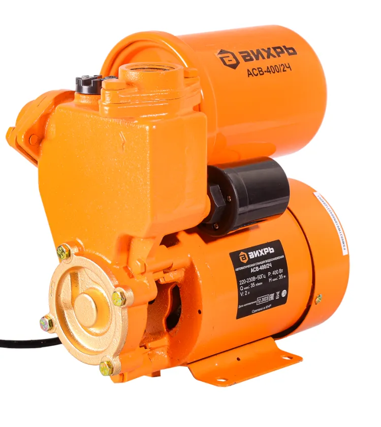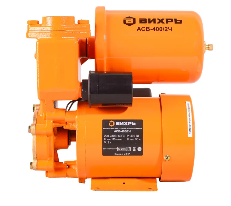 Насосная станция предназначена для бесперебойного водоснабжения в автоматическом режиме, коттеджей, дач, ферм и других потребителей. При этом она автоматически поддерживает необходимое давление в системе водоснабжения, самостоятельно включаясь и отключаясь по мере расходования воды потребителями. Комплектация Насосная станция в сборе; Руководство по эксплуатации. Диаметр выходного отверстия, дюйм 1 Частота, Гц 50 Высота напора, м 35 Материал Чугун Мощность, Вт 400 Напряжение сети, В 220 Вес 8.25 кг Бренд Вихрь Максимальная производительность, л/мин 35 Габариты упаковки 0.247 × 0.247 × 0.247 м Емкость гидроаккумулятора, л 2 Допустимая концентрация твердых частиц в перекачиваемой воде, г/м³ 150 Максимальная глубина всасывания, м 9 Диаметр входного отверстия, дюйм 1