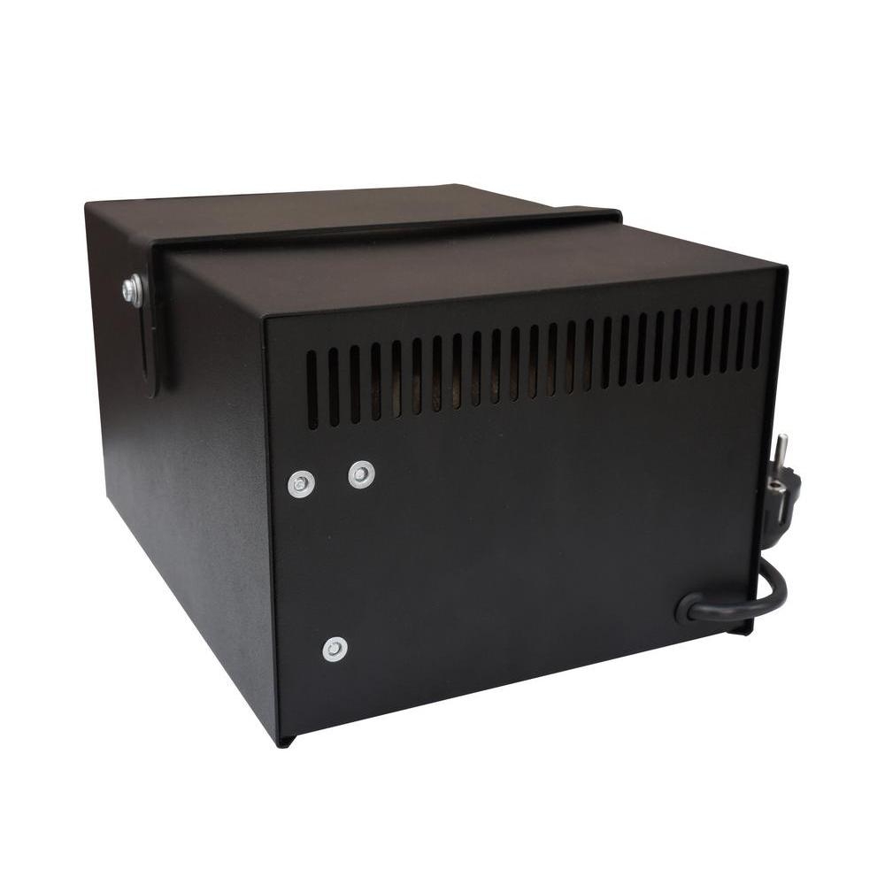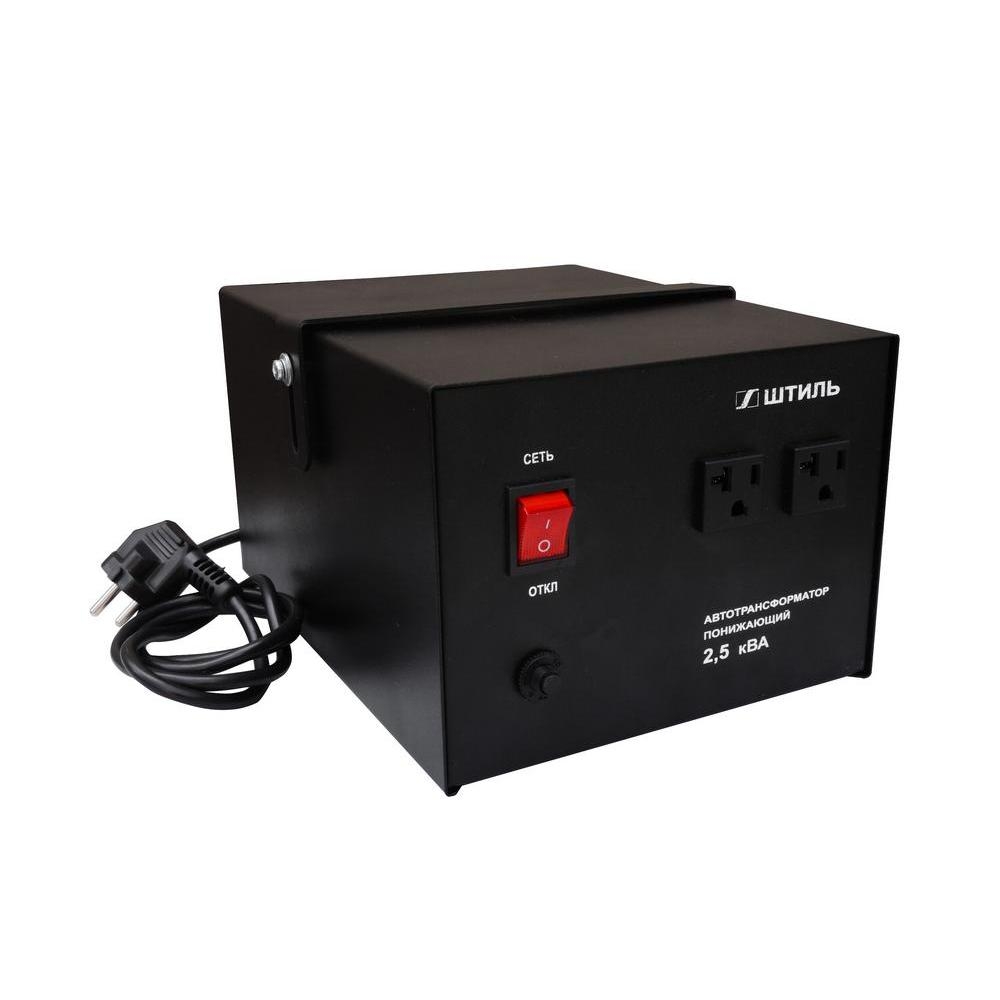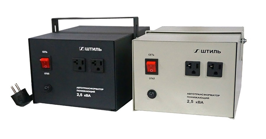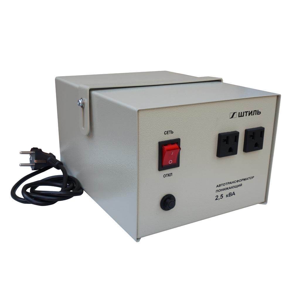 Понижающие автотрансформаторы "Штиль" предназначены для электропитания приборов, аппаратуры и устройств переменным током напряжением 110 В от стандартной электросети с напряжением 220 В. Автотрансформаторы "Штиль" могут быть использованы для электропитания зарубежной аппаратуры, рассчитанной на электропитающую сеть 50/60 Гц 110 В. Изделие представляет собой понижающий однофазный преобразователь напряжения, состоящий из следующих основных частей: металлический корпус, понижающий автотрансформатор на тороидальном сердечнике, клавишный выключатель "СЕТЬ", две розетки американского стандарта для подключения нагрузки на 110 Вольт, самовосстанавливающийся предохранитель, сетевой шнур с евровилкой Условное обозначение "Штиль" АТ 220/110-2,5-50 где: АТ (или Т) - тип изделия: автотрансформатор (трансформатор); 220 - входное напряжение, В; 110 - выходное напряжение, В; 2,5 - номинальная мощность, кВА; 50 - частота питающей сети, Гц Технические характеристики Входное напряжение, В 220±6% Диапазон выходного напряжения, В 110-112 КПД, % 98 Максимальная мощность нагрузки, кВА 2,5 Максимальный выходной ток, А 22,7 Частота, Гц 50 Габаритные размеры (В х Ш х Г), мм 190 х220 х290 Длина провода, м 1,3 Масса, кг 13 Гарантийный срок, мес 24 После транспортирования или хранения изделия при отрицательных температурах перед включением необходимо выдержать его в указанных условиях эксплуатации не менее 4-х часов. В изделии АТ 220/110-2,5-50 предусмотрено ограничение пускового тока включения. В связи с этим повторное включение изделия рекомендуется производить не менее чем через 5 минут после его выключения. При работе с нагрузкой, имеющей большие пусковые токи включения и характеризующейся повторно-кратковременным режимом работы (электродрель, миксер, компрессор и аналогичные электроприборы), следует иметь в виду, что номинальная мощность нагрузки, подключаемой к изделию АТ 220/110-2,5-50, не должна превышать 7001000 ВА.