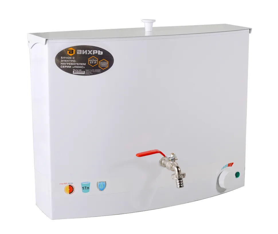 Бачок с электронагревателем Вихрь отличное решение для дач и частных домов, в которых отсутствует горячее водоснабжение. Устройство имеет компактные размеры, поэтому монтаж проводится быстро и легко. Для простой фиксации предусмотрены два кронштейна. Вес устройства всего 4,5 кг, не создает большую нагрузку, прост в транспортировке. Объем бачка равен 17 л достаточное количество подогретой воды позволяет обеспечить комфорт при отсутствии горячего водоснабжения. Бачок комплектуется электрическим нагревательным элементом мощностью 1300 Вт. Благодаря ему, нагрев занимает 40 минут времени. Подогретая вода может использоваться для мытья посуды, рук и прочих гигиенических процедур, других целей. Бачок с электронагревателем Вихрь окрашен в белый цвет, поэтому отличается универсальностью. Комплектуется металлическим краном. Благодаря нанесенному слою краски, обеспечивается надежная защита от коррозии и длительный срок эксплуатации. Характеристики Вес, кг 4.5 кг Модель/Серия ЛЮКС Бренд Вихрь Цвет белый