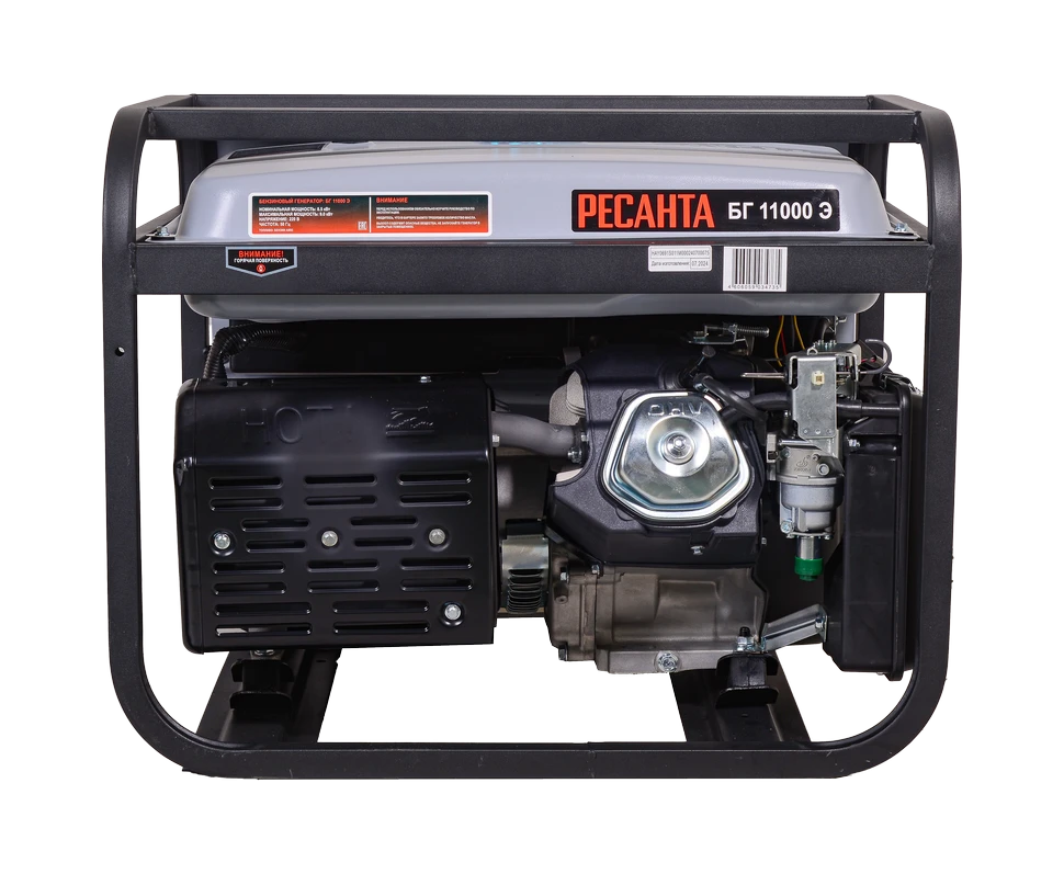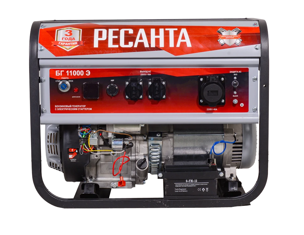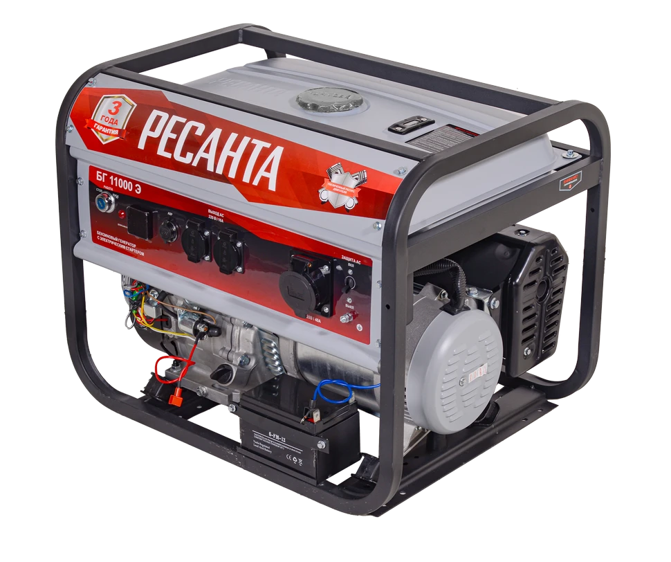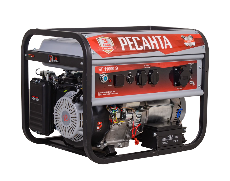 Электрогенератор бензиновый (бензогенератор) - электрическая машина, предназначенная для автономного электроснабжения в повторнократковременном режиме потребителей бытового и аналогичного назначения, относящихся к классу переносных электроприемников. В качестве первичного двигателя используется карбюраторный двигатель, топливом для которого является неэтилированный бензин. Электрогенератор РЕСАНТА имеет бытовое назначение. Напряжение сети, В: 220 Частота, Гц: 50 Мощность, Вт: 8500 Коэффициент мощности: 1.0 Тип генератора: Синхронный, щёточный Мощность, л.с.: 19 Расход топлива, г/кВтч: 380 Расход масла, г./кВтч: 6.8 Количество цилиндров: 1 Число тактов: 4 Тип стартера: Ручной и электрический Система подачи топлива: Свободный слив (самотек) Охлаждение: Воздушный принудительный Система зажигания: Магнето Тип свечи зажигания: F6TC, F7TC и аналогичные Система питания: Карбюратор Тип воздушного фильтра: Пористый полиуретан Тип топлива: Бензин АИ-92 неэтилированный / газ пропан (пропан-бутан) при установке газового оборудования Тип системы смазки: Разбрызгиванием в картере Объем топливного бака, л: 25 Ёмкость системы смазки, мл: 1100 В условиях временного или постоянного отсутствия электроэнергии обеспечить питание электрооборудования можно с помощью генератора РЕСАНТА модели БГ 11000 Э. Несмотря на компактные габариты и относительно небольшой вес, бензогенератор демонстрирует высокий КПД и хорошие показатели мощности. Генератор РЕСАНТА БГ 11000 Э имеет увеличенный ресурс двигателя, медную обмотку альтернатора. Оснащен многофункциональным цифровым дисплеем с индикацией величины напряжения, частоты тока и счетчиком моточасов; Модель БГ 11000 Э имеет 2 розетки 16 А. Агрегат оснащен надежным одноцилиндровым двигателем, который работает на неэтилированном бензине. Сфера применения установки включает в себя, как коммерческие объекты (магазины, ларьки, офисы), так и загородные дома, дачи, подсобные хозяйства. При покупке бензинового генератора Ресанта БГ 11000 Э, Вы останетесь довольны его прекрасной производительностью и компактным внешним видом. Особенности: - Генераторы имеют увеличенный ресурс двигателя; - Имеют медную обмотку альтернатора; - Оснащены многофункциональным цифровым дисплеем с функциями индикации величины напряжения, частоты тока и счетчика моточасов; - Все модели с электростартером (Э) имеют в комплекте аккумулятор;