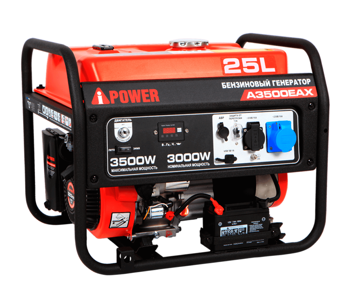 Бензиновый генератор A-iPower A3500EAX станет Вашим надежным источником питания при отсутствии электроэнергии. Этот генератор с максимальной мощностью 3,5 кВт и номинальной мощностью 3 кВт работает до 14 часов при 100% нагрузке! Это уникальная модель, которая может выдержать 7,0 кВA пусковой мощности. Такая особенность очень пригодится для подключения техники с электродвигателем, которая требует высокой пиковой мощности при запуске. Характеристики Сертификат СЕ есть Вес изделия, кг 48.7 Вес в упаковке, кг 52.2 Габаритные размеры упаковки, мм 620*480*500 Объем упаковки, куб.м 0,15 Габаритные размеры изделия (ДхШхВ), мм 614*460*490 Комплектация Генератор/Инструкция/Вилка электрическая/Свечной ключ/Воронка Уровень шума на 7 м, дБ 77 Класс изоляции F Стартер Ручной/Электро/ATS Двигатель Серия SC230 Тип 4-тактный, OHV Производитель двигателя A-iPower Скорость вращения (макс./ном), об/мин 3600/3000 Тип регулятора оборотов Центробежный регулятор Мощность, кВт/л.с. при 3600 об/мин 5.0 кВт/ 7.5 л.с. Мощность, кВт/л.с. при 3000 об/мин 4.6 кВт / 6.3 лс Тип топлива / класс Бензин АИ-92 Тип масла, SAE SAE 10W-30 Объем масляного картера, л 0,6 Количество цилиндров 1 Тип охлаждения Воздушное Наличие топливного крана есть Расход топлива при нагрузке 25%, л / час 0,888 Расход топлива при 50% нагрузке, л / час 1,14 Расход топлива при загрузке 75%, л / час 1,45 Расход топлива при 100% нагрузке, л / час 1,811 Генератор Тип контроля напряжения AVR Максимальная мощность, кВт 3.5 Номинальная мощность, кВт 3 Пусковая мощность, кВА 7,0 Сила тока, А 13,0 Количество полюсов 2 Коэффициент мощности (cos) 1 Класс защиты IP23 Напряжение, В 230 Частота, Гц 50 Переключатель ЗИМА/ЛЕТО для АВР Да Количество фаз 1 Высокие пусковые токи Да Оснащение Ручка для транспортировки Дополнительная опция Цифровой дисплей Есть Выход USB Есть Разъем для подключения автоматики Есть Лёгкий старт Да A-iPower A3500EAX оснащен компактным гильзованным 4-тактный OHV-двигателем объемом 223 куб. см с электрическим стартером. На панели управления находится одна стандартная розетка 230В/16А, одна силовая розетка 230В/16А, и разъем USB, от которого можно подзарядить смартфон, планшет и другие гаджеты. На цифровой дисплей в режиме реального времени выводятся сведения о работе генератора. Генератор имеет выход для подключения АВР, с возможностью организации источника резервного питания для загородного дома, магазина или кафе. Уникальность этой модели в наличии режима Зима/Лето на панели генератора при подключении АВР для легкого запуска в любое время года. Бензиновый генератор A-iPower A3500ЕАХ оснащен автоматом защиты, который при перегрузке предотвратит выход из строя и остановит генератор. Также система защиты предотвратит запуск двигателя при снижении уровня масла. На генератор бензиновый 3500 распространяется 4-летняя расширенная гарантия, при регистрации на сайте производителя. A-iPower это американское качество и высочайшая надёжность.