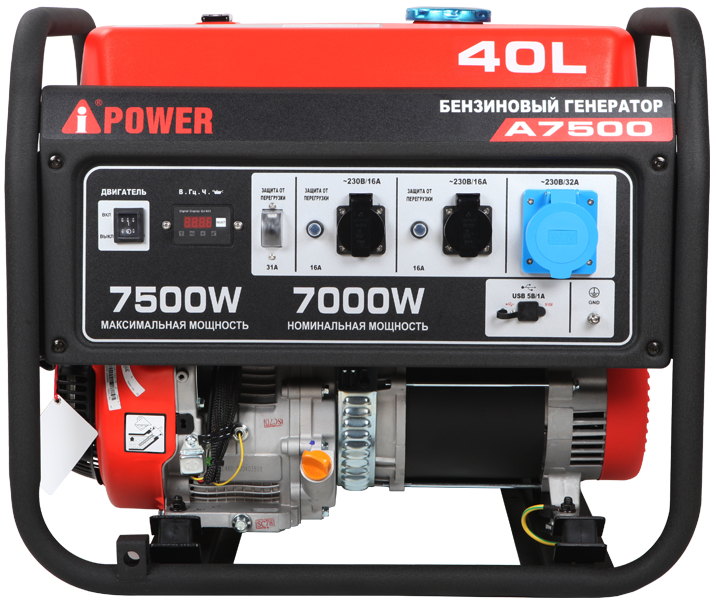 Бензиновый генератор A-iPower A7500 станет Вашим надежным источником питания при отсутствии электроэнергии. Этот генератор с максимальной мощностью 7500 Вт и номинальной мощностью 7000 Вт работает до 9,7 часов при 100% нагрузке! Двигатель Двигатель Серия: Е1000 Тип: 4-тактный, OHV Объём двигателя, куб.см: 459 Скорость вращения (макс./ном), об/мин: 3600/3000 Тип регулятора оборотов: Центробежный регулятор Мощность, кВт/л.с. при 3600 об/мин: 66 Мощность, кВт/л.с. при 3000 об/мин: 9.5/13hp Тип топлива / класс: Бензин АИ-92 Тип масла, SAE: SAE 10W-40 Объем масляного картера, л: 1.1 Количество цилиндров: 1 Тип охлаждения: Воздушное Наличие топливного крана: есть Расход топлива при нагрузке 25%, л / час: 1,817 Расход топлива при 50% нагрузке, л / час: 2,433 Расход топлива при загрузке 75%, л / час: 3,092 Расход топлива при 100% нагрузке, л / час: 4,125 Генератор Тип контроля напряжения: AVR Количество фаз: 1 Максимальная мощность, кВт: 7.5 Номинальная мощность, кВт: 7.0 Пусковая мощность, кВА: 7.5 Количество полюсов: 2 Коэффициент мощности (cos): 1 Класс защиты: IP23 Напряжение, В: 230 Частота, Гц: 50 Высокие пусковые токи: Нет Оснащение Сертификат СЕ: есть Габаритные размеры упаковки, мм: 735*559*650 Уровень шума на 7 м, дБ: 82 Класс изоляции: F Переключатель ЗИМА/ЛЕТО для АВР: Нет Цифровой дисплей: Есть Выход USB: Есть Разъем для подключения автоматики: Нет A-iPower A7500 оснащен мощным гильзованным 4-тактным OHV-двигателем объемом 459 куб. см с ручным стартером. На панели управления находятся две стандартные розетки 230В/16А, одна силовая розетка 230В/32А, и разъем USB, от которого можно подзарядить смартфон, планшет и другие гаджеты. На цифровой дисплей в режиме реального времени выводятся сведения о работе генератора. A-iPower A7500 оснащен автоматами защиты, которые при перегрузке предотвратят выход из строя и остановят генератор. Также система защиты предотвратит запуск двигателя при снижении уровня масла. На генератор A-iPower A7500 распространяется 4-х летняя расширенная гарантия, при регистрации на сайте производителя. A-iPower это американское качество и высочайшая надёжность.