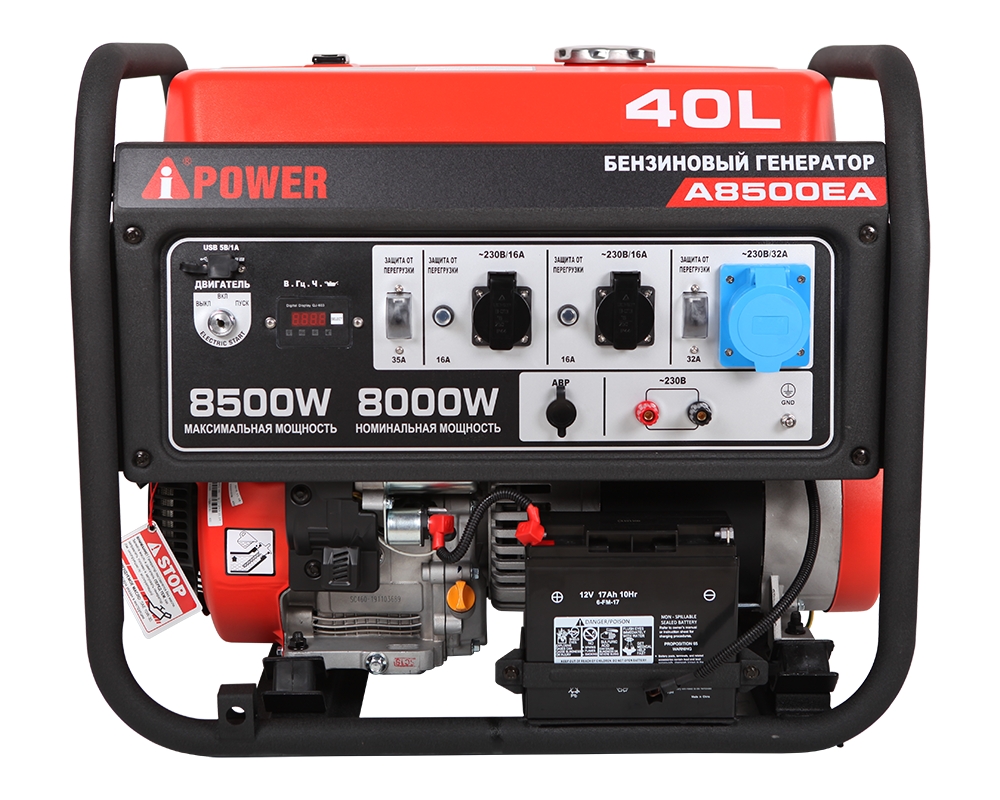 Бензиновый генератор A-iPower A8500EA станет Вашим надежным источником питания при отсутствии электроэнергии. Этот генератор с максимальной мощностью 8500 Вт и номинальной мощностью 8000 Вт работает до 9.6 часов при 100% нагрузке! Характеристики Мощность, Вт: 8500 Цифровой дисплей: Есть Выход USB: Есть Разъем для подключения автоматики: Есть Вес брутто / нетто, кг: 107.8/101.8 Габаритные размеры электростанции, мм: 710*534*605 Габаритные размеры упаковки, мм: 735*559*650 Сертификат СЕ: есть Объем масляного картера, л: 1.1 Генератор Модель / Производитель: A8500EA/A-iPower Тип контроля напряжения: AVR Класс изоляции: F Количество полюсов: 2 Количество фаз: 1 Коэффициент мощности (cos): 1 Класс защиты: IP23 Напряжение, В: 230 Частота, Гц: 50 Двигатель Серия: Е1000 Тип: 4-тактный, OHV Объём двигателя, куб.см: 459 Мощность при 3600 об/мин, л.с.: 16.0 Мощность, кВт / л.с. при 3000 об / мин: 9.5/13hp Тип топлива / класс: Бензин АИ-92 Тип масла, SAE: 10W40 Количество цилиндров: 1 Тип охлаждения: Воздушное Скорость вращения (макс./ном), об/мин: 3600/3000 Тип регулятора оборотов: Центробежный регулятор Наличие топливного крана: есть Расход топлива при нагрузке 25%, л / час: 1,931 Расход топлива при 50% нагрузке, л / час: 2,582 Расход топлива при загрузке 75%, л / час: 3,429 Расход топлива при 100% нагрузке, л / час: 4,161 Уровень шума на 7 м, дБ: 82 A-iPower A8500EA оснащен мощным гильзованным 4-тактным OHV-двигателем объемом 459 куб. см с электрическим стартером. На панели управления находятся две стандартные розетки 230В/16А, одна силовая розетка 230В/32А, клеммы для снятия полной мощности, и разъем USB, от которого можно подзарядить смартфон, планшет и другие гаджеты. На цифровой дисплей в режиме реального времени выводятся сведения о работе генератора. Электростартер обеспечивает быстрый и лёгкий запуск двигателя (аккумулятор входит в комплект поставки). К этой модели можно подключить блок автоматики, который сам запустит генератор, если в доме отключится основное электроснабжение. A-iPower A8500EA оснащен автоматами защиты, которые при перегрузке предотвратят выход из строя и остановят генератор. Также система защиты предотвратит запуск двигателя при снижении уровня масла. Бензиновый генератор 8 квт A-iPower A8500EA распространяется 4-х летняя расширенная гарантия, при регистрации на сайте производителя. A-iPower это американское качество и высочайшая надёжность.