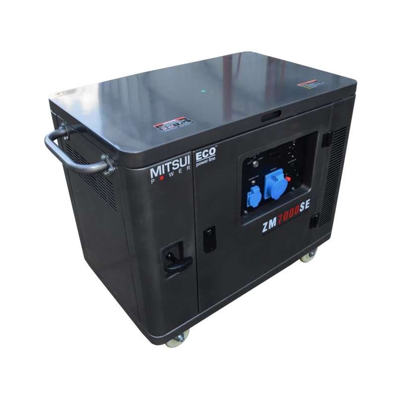 Бензиновый генератор Mitsui Power ZM 7000 SЕ серии ECO производится компанией Mitsui Power Co., на высокотехнологичном заводе в Гонконге. Генератор оснащен надежным двигателем (чугунные гильзы, поршневые кольца из высококачественного металла с напылением хрома, впускные и выпускные клапана изготовлены с напылением из твердосплавных материалов), а так же надежным и качественным альтернатором с обмоткой ротора и статора из 100 % меди с высоким классом изоляции, автоматическим регулятором напряжения (АВР) нового поколения, что позволяет добиться снижения гармонического искажения синусоиды напряжения, тока и частоты менее 5%. Основные характеристики Номинальная мощность, кВт: 5 Максимальная мощность, кВт: 5.5 Напряжение, В: 230 Тип запуска: Ручной / электростартер Регулятор напряжения: AVR Счетчик моточасов: Есть Розетки: 16А 230В (тип Shuko) х 1, 32A 230В (тип CEE) х 1 Исполнение: В кожухе Вес: 120 кг Габариты: 1103 × 603 × 930 мм Двигатель Производитель двигателя: Mitsui Модель двигателя: ZX 360 Число тактов: 4 Тип топлива: Бензин Мощность двигателя, л.с.: 13 Объем двигателя, л: 0.36 Количество цилиндров: 1 Расположение цилиндров: рядное Частота вращения вала, об/мин: 3000 Уровень шума, дБ: 67 Альтернатор Тип альтернатора: Синхронный Частота тока, Гц: 50 Номинальный коэффициент мощности: 1 Топливная система Топливный бак, л: 27 Расход топлива при 75% нагрузке, л/ч: 2.5 Система охлаждения Тип системы охлаждения: Воздушная Масляная система Объем системы смазки, л: 1.1 Бензиновый генератор Mitsui Power ZM 7000 SЕ серии ECO отличается оригинальным дизайном и имеет высококлассное оснащение: Шумозащитный, всепогодный кожух. Электрический старт (аккумулятор в комплекте) 27- литровый бак с антикоррозийным покрытием и индикатором уровня топлива. Шасси, для удобства перемещения генератора. Счетчик моточасов, для контроля технического обслуживания генератора. Увеличенный глушитель, для снижения уровня шума. 1 евро розетка 220 В, 16 А, 1 силовая розетка 220 В, 32 А. Выход 12 Вольт постоянного тока, для зарядки аккумулятора. Защита от перегрузки и КЗ. Защита от недостаточного уровня масла в двигателе. Электростанции Mitsui Power Eco укомплектованны аккумулятором, счетчиком мточасов,выходом 12V,датчиком уровня топлива, а так же шасси и ручкой для удобства премещения оборудования.