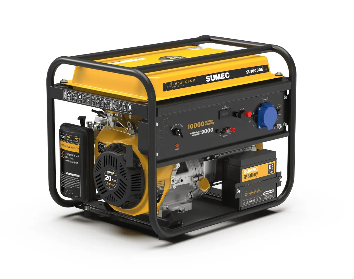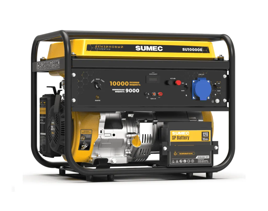 Однофазный двухцилиндровый бензогенератор SUMEC SU10000E это одна из многочисленных моделей линейки бензиновых генераторов SUMEC, максимальной мощностью 10000Вт/50Гц. Предназначен для резервного питания потребителей различных сфер деятельности. Основные характеристики Напряжение/частота (В/Гц): 230/50 Номинальная мощность генератора (кВт): 9 Максимальная мощность генератора (кВт): 10 Расход топлива (л/час): 5 Дополнительная информация Система пуска: ручной стартер, электростартер Объем топливного бака (л): 28 Исполнение: открытое на раме Приборы контроля: мультиметр 3в1 Дисплей: сегментный светодиодный Сила тока на фазу номинальная (А): 39 Фаз: 1 Выводов переменного тока (шт): 2 Выход 12V (Ампер): 8.3 Коэффициент мощности (Cos f): 1 Двигатель Двигатель, общее описание: 4-тактный, одноцилиндровый, воздушного охлаждения, OHV Тип двигателя: бензиновый Производитель двигателя: SUMEC Объем двигателя , см.куб.: 500 Мощность двигателя (л.с.): 20 Число цилиндров: 1 Число оборотов двигателя (об/мин): 3000 Система регулировки оборотов двигателя: механическая Система охлаждения: воздушная Емкость масленого картера (л): 1.1 Тип масла: SAE10W30, SAE10W40 Тип топлива: Бензин Альтернатор /генератор переменного тока/: синхронный, щеточный Альтернатор - материал обмоток: ротор - алюминий, статор - медь Транспортная информация Сухой вес (кг): 93 Вес брутто (кг): 96 Упаковка: картон Бензиновый генератор SUMEC SU10000E имеет стандартный для электростанций с медной обмоткой вес и габариты, что позволяет в кратчайшие сроки обеспечить подачу электроэнергии напряжением 220 В посредством розети 32А и дополнительным терминалом для подключения мощных нагрузок, расположенных на лицевой стороне генератора. В качестве топлива в SU10000E используется бензин, который заправляется в бак объемом 28 литров. Экономичный режим работы позволяет до 6 часов работать бесперебойно. В качестве смазывающей жидкости используется масло марки 10w30 или 10w40. Дополнительно генератор оснащен датчиком уровня топлива и масла. Система охлаждения - воздушная. Генератор имеет ручную и электрическую систему запуска.