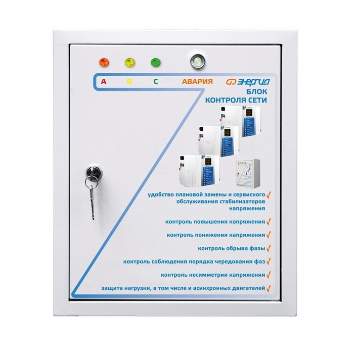 Устройство предназначено для автоматической защиты трехфазных потребителей подключенных к трехфазной сети 380В от различных аварийных ситуаций. Например, обрыв или перекос фаз, несимметрия, вызванная повышенным или пониженным сетевым напряжением. Блок применяется в комплекте с тремя одинаковыми однофазными стабилизаторами, суммарной мощностью от 45 до 60 кВА. В случае аварии одной из фаз блок можно переключить в однофазный режим работы обеспечив тем самым питание однофазных потребителей на оставшихся двух фазах. При этом трехфазные потребители должны быть отключены от сети.