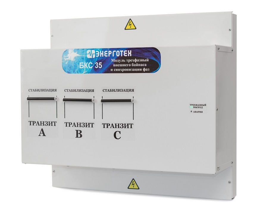 Модуль трехфазный внешнего байпаса и синхронизации фаз БКС, предназначен для объединения трех любых однофазных стабилизаторов напряжения для работы в трехфазном режиме. Модуль БКС может быть использован без стабилизаторов напряжения, для организации защиты трехфазных нагрузок от неполнофазного режима. Максимальная мощность нагрузки по каждой фазе: 35, кВА Модели стабилизаторов, доступные для подключения через Модуль: Все модели стабилизаторов мощностью до 35 кВА Габаритные размеры Модуля: 315 × 745 × 670 (Г × Ш × В), мм Масса Модуля: 30, кг Модуль БКС обеспечивает: независимый монтаж стабилизаторов и модуля; быстрое подключение, возможность оперативной замены любого стабилизатора, либо отключение для осуществления ремонта в сервисном центре; время обесточенного состояния нагрузки при использовании внешнего байпаса не более 1 минуты; защиту от пропадания и асимметрии фаз для трехфазных нагрузок; бесперебойную работу однофазных нагрузок, при пропадании напряжения на соседней фазе; возможность, при необходимости, объединения стабилизаторов разной мощности и точности; задержку на отключение трехфазной нагрузки после пропадания напряжения на одной из фаз 3 секунды; задержку на включение трехфазной нагрузки после восстановления напряжения на всех трех фазах 5 секунд; защиту трехфазной нагрузки в режиме транзит от выхода напряжения за границы диапазона 180 260 В; Модуль БКС предназначена для объединения трех однофазных стабилизаторов напряжения для работы в трехфазном режиме. Модуль легко навешивается на кронштейн, крепящийся к стене. В нижней части Модуля БКС за защитной крышкой расположен ряд клеммников для подключения стабилизаторов напряжения. В верхней части за крышкой расположены клеммники для подключения входной линии и нагрузок. На передней панели блока расположены переключатели режимов работы каждого подключенного стабилизатора, «Стабилизация» «Транзит» и два светодиода индикации режима работы блока синхронизации. Внутри блока расположен контактор, который подает напряжение на трехфазный выход только, когда напряжение на всех трех фазах находится в диапазоне 180 260 В. При работе всех трех стабилизаторов в режиме «Стабилизация» блок контролирует только пропадание фаз. При переключении одного или нескольких переключателей в режим «Транзит», блок может отключить трехфазный выход при сильном отклонении напряжения (выходе за диапазон 180 260 В) на нестабилизированной фазе. Отключение трехфазной нагрузки при пропадании напряжения на одной из фаз происходит с задержкой в 3 секунды, в течение этого времени мигает красный светодиод «Авария». Кроме случая, когда отключилась фаза А, напряжение которой используется для питания контактора. В этой ситуации трехфазная нагрузка будет обесточена сразу, а не позднее чем через 1 секунду погаснет зеленый и загорится красный светодиод. Подключение трехфазной нагрузки контактором происходит с задержкой в 5 секунд после восстановления напряжения на всех трех фазах, в течение этого времени подмигивает (яркость свечения меняется от полной до половинной) красный светодиод «Авария». Для однофазных нагрузок на Модулю предусмотрены несинхронизированные выходы, которые не отключаются контактором. При необходимости осуществления обслуживания, ремонта или замены одного из стабилиза