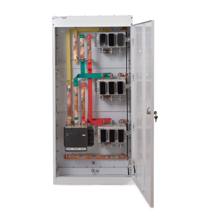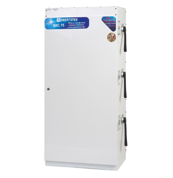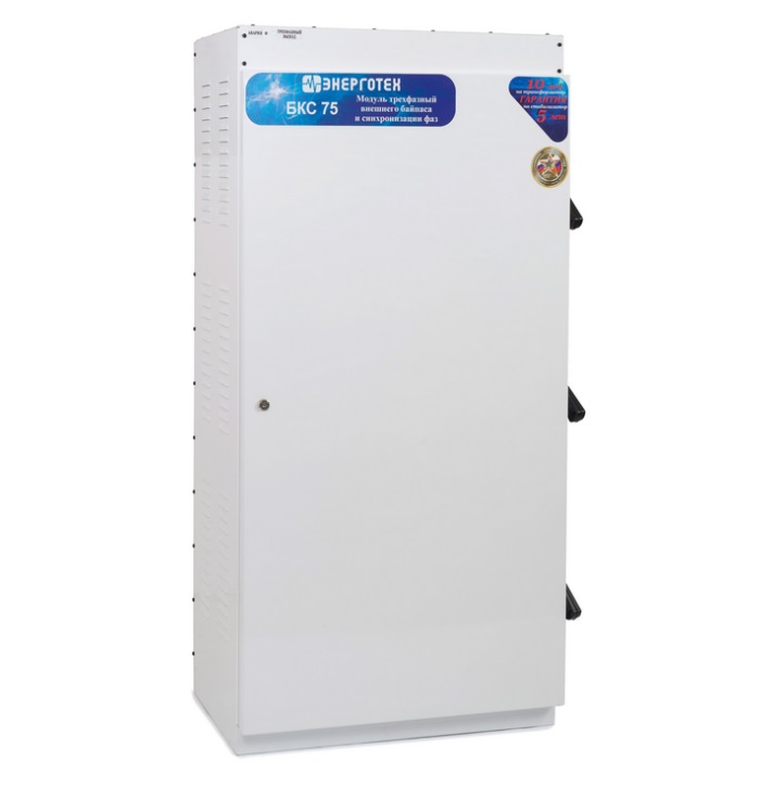 Модуль трехфазный внешнего байпаса и синхронизации фаз БКС, предназначен для объединения трех любых однофазных стабилизаторов напряжения для работы в трехфазном режиме. Модуль БКС может быть использован без стабилизаторов напряжения, для организации защиты трехфазных нагрузок от неполнофазного режима. Модель: БКС 75 Максимальная мощность нагрузки по каждой фазе: 75, кВА Модели стабилизаторов, доступные для подключения через модуль: все модели стабилизаторов мощностью до 75 кВА Габаритные размеры: (Г × Ш × В): 320 × 560 × 1105, мм3 Масса: 45, кг Модуль БКС обеспечивает: независимый монтаж стабилизаторов и модуля; быстрое подключение, возможность оперативной замены любого стабилизатора, либо отключение для осуществления ремонта в сервисном центре; время обесточенного состояния нагрузки при использовании внешнего байпаса не более 1 минуты; защиту от пропадания и асимметрии фаз для трехфазных нагрузок; бесперебойную работу однофазных нагрузок, при пропадании напряжения на соседней фазе; возможность, при необходимости, объединения стабилизаторов разной мощности и точности; задержку на отключение трехфазной нагрузки после пропадания напряжения на одной из фаз 3 секунды; задержку на включение трехфазной нагрузки после восстановления напряжения на всех трех фазах 5 секунд; защиту трехфазной нагрузки в режиме транзит от выхода напряжения за границы диапазона 180 260 В; Модуль рассчитан на непрерывный режим работы в закрытых помещениях при: температуре окружающей среды от -25 до +45 °C; относительной влажности до 80% (при 25°C); атмосферном давлении от 630 до 800 мм рт. ст. Модуль БКС предназначена для объединения трех однофазных стабилизаторов напряжения для работы в трехфазном режиме. Модуль легко навешивается на кронштейн, крепящийся к стене. В нижней части Модуля БКС за защитной крышкой расположен ряд клеммников для подключения стабилизаторов напряжения. В верхней части за крышкой расположены клеммники для подключения входной линии и нагрузок. На передней панели блока расположены переключатели режимов работы каждого подключенного стабилизатора, «Стабилизация» «Транзит» и два светодиода индикации режима работы блока синхронизации. Внутри блока расположен контактор, который подает напряжение на трехфазный выход только, когда напряжение на всех трех фазах находится в диапазоне 180 260 В. При работе всех трех стабилизаторов в режиме «Стабилизация» блок контролирует только пропадание фаз. При переключении одного или нескольких переключателей в режим «Транзит», блок может отключить трехфазный выход при сильном отклонении напряжения (выходе за диапазон 180 260 В) на нестабилизированной фазе. Отключение трехфазной нагрузки при пропадании напряжения на одной из фаз происходит с задержкой в 3 секунды, в течение этого времени мигает красный светодиод «Авария». Кроме случая, когда отключилась фаза А, напряжение которой используется для питания контактора. В этой ситуации трехфазная нагрузка будет обесточена сразу, а не позднее чем через 1 секунду погаснет зеленый и загорится красный светодиод. Подключение трехфазной нагрузки контактором происходит с задержкой в 5 секунд после восстановления напряжения на всех трех фазах, в течение этого времени подмигивает (яркость свечения меняется от полной до половинной) красный светодиод «Авария». Для од