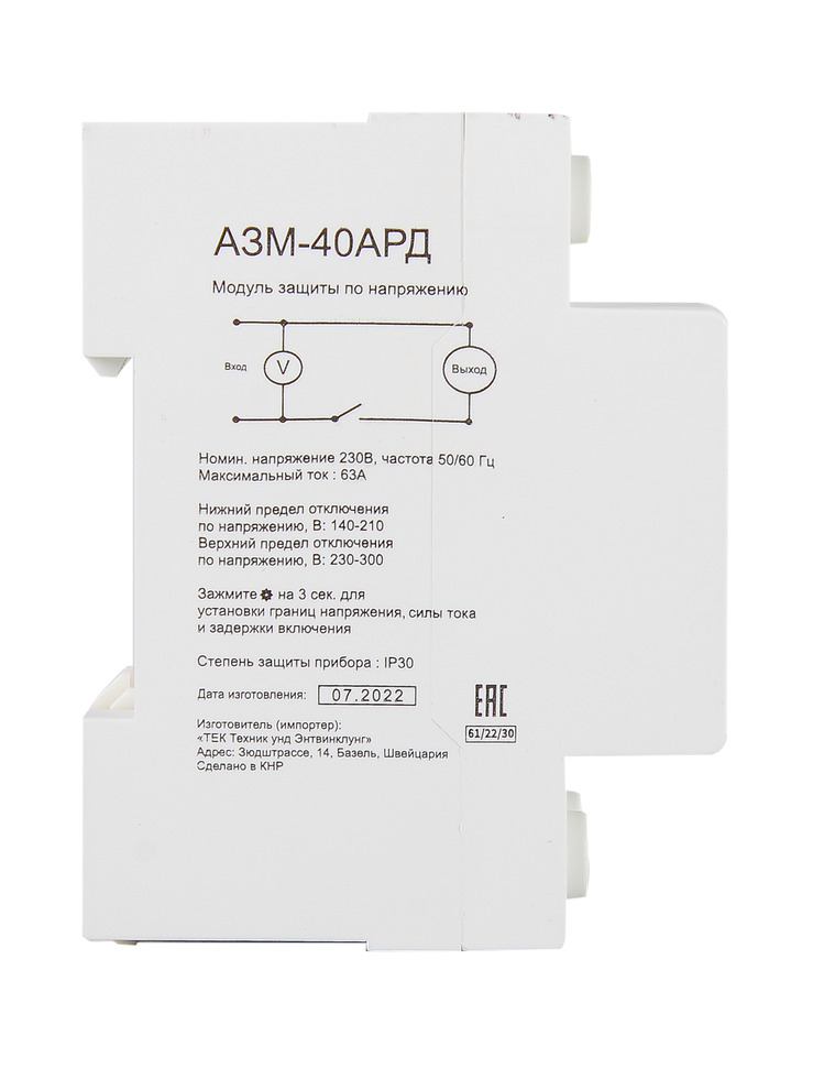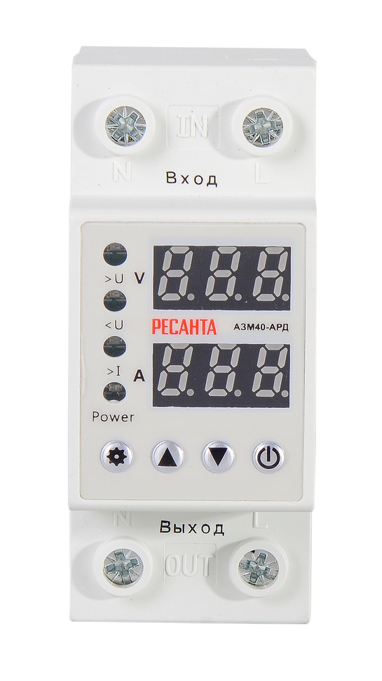 АЗМ - автоматическое устройство защиты от повышенного/пониженного напряжения, в основном используемое для низковольтных распределительных линий для бытовых и аналогичных целей, автоматически обнаруживает сбой, связанный с повышением или понижением напряжения, и отключается, при восстановлении нормальных условий на линии, автоматически включается. Предельное значение повышенного напряжения при отключении 275+/-5 В(напряжение переменного тока) Предельное значение повышенного напряжения при включении 230-275 В(напряжение переменного тока) Предельное значение пониженного напряжения при отключении 160+/-5 В(напряжение переменного тока) Предельное значение пониженного напряжения при включении: 150-200 В(напряжение переменного тока) Время воздействия: при понижении давления 0.8 с, при повышении давления 0.2-5с Потребляемая мощность =1,5 Вт Номинальная частота переменного тока, Гц 50