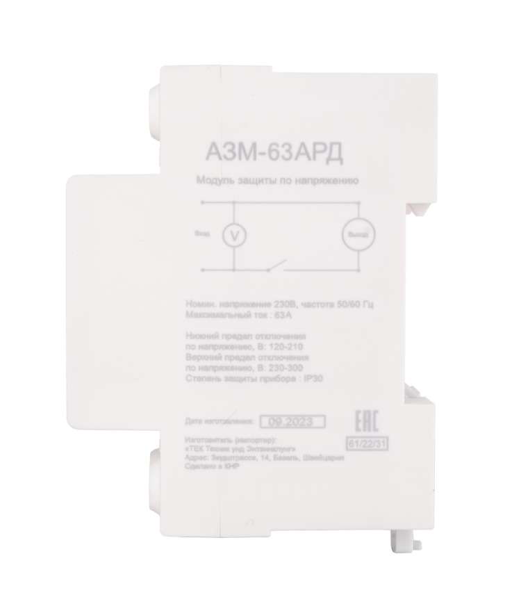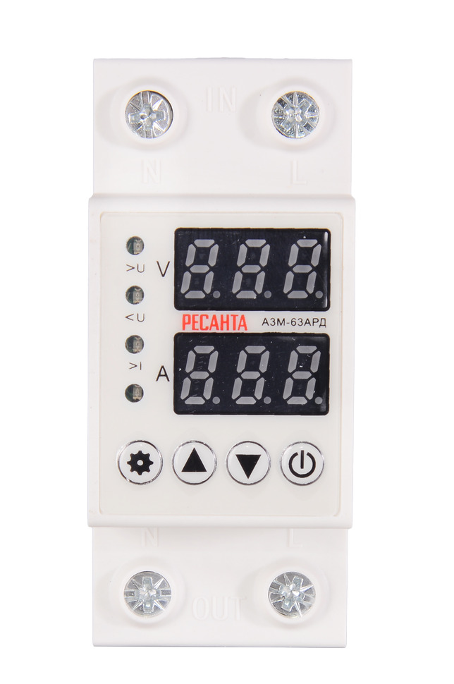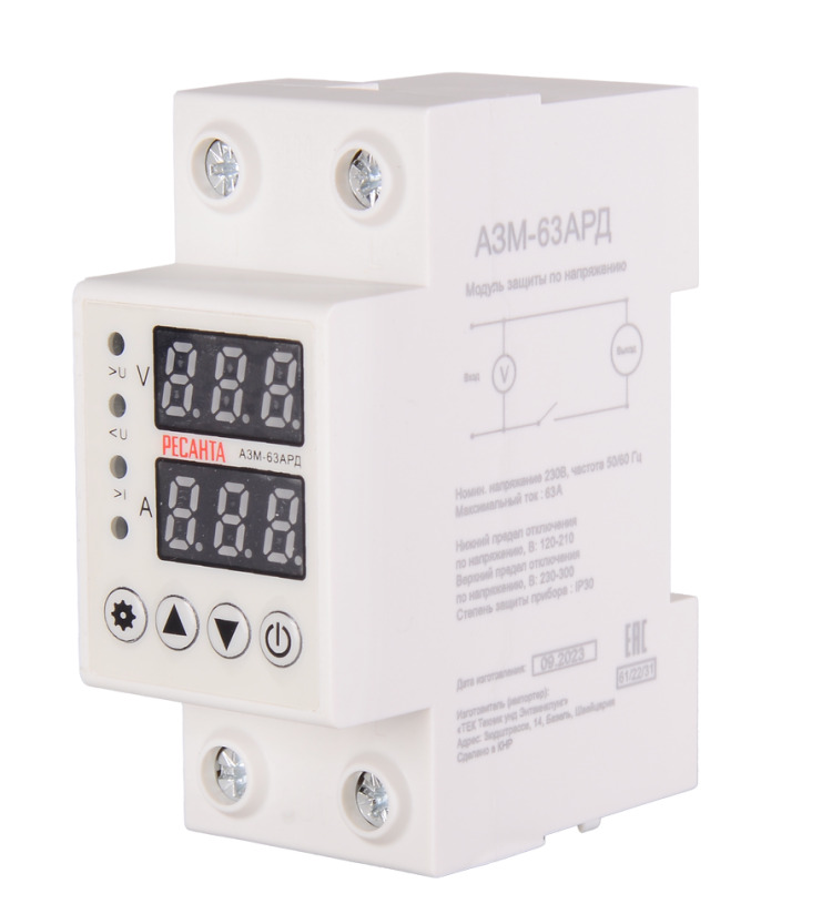 Блок защиты по напряжению Ресанта АЗМ-63АРД это защитный модуль, который срабатывает при повышении или понижении напряжения в бытовой электросети. Он работает в автоматическом режиме: отключается, если параметры сети отклоняются от заданных, и включается, когда они возвращаются в норму. Предельные значения силы тока и напряжения, а также задержка включения при срабатывании автоматической защиты программируются с помощью клавиш настройки. На дисплее отображается входное напряжение и подключение нагрузки. Цветовые индикаторы сообщают о режиме работы реле контроля напряжения. Максимальный ток, А: 63 Номинальное напряжение: 230 Частота, Гц: 50 Номинальная потребляемая мощность, Вт: 1,5 Максимальная мощность с нагрузкой, кВА: 13,9 Предельное напряжение максимального предела при отключении, В: 230-300 Предельное напряжение нижнего предела при отключении, В: 120- 210 Предельное значение повышенного напряжения при включении, В: < 275 Предельное значение пониженного напряжения при включении, В: > 165 Задержка подачи электроэнергии после отключения, с: 1-600 Электромеханический ресурс, раз: 100000 Габариты упаковки: 0.069 × 0.069 × 0.069 м Вес: 0.169 кг Блок защиты по напряжению имеет номинальную потребляемую мощность 1,5 Вт. Он устанавливается на стандартную ДИН-рейку 35 мм с помощью защелки. Модель Ресанта АЗМ-63АРД подходит для сетей с номинальным напряжением 230 В. Максимальная сила тока равна 63 А. Максимальная мощность с нагрузкой не должна превышать 13,9 кВА. Отключение можно настроить на диапазон значений 230-300 В для повышенного напряжения и 120 - 210 В для пониженного. Задержку включения реле выставляют в границах от 1 до 600 с. по напряжению и от 1 до 30 с. по току. АЗМ рассчитано на более чем 100 000 срабатываний.