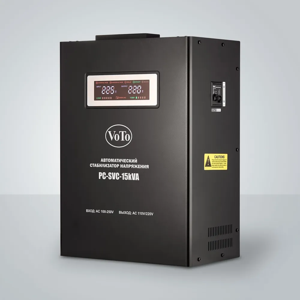 PC-SVC 100-15kVA электромеханический стабилизатор напряжения, отличительной особенностью которого является возможность работы с широким диапазоном по входному напряжения (100 - 270 Вольт) в пределах погрешности выходного напряжения не более 220 Вольт +/- 3%! Особенностью данной модели является возможность использования выходного напряжения на 220 или 110 Вольт, для импортной техники. Мощность: 15000 ВА Рабочий диапазон: 100-250 В Выходное напряжение: 220/110 ± 3% Количество фаз: Однофазный Рабочая частота: 50-60 Гц Влажность: не более 80% Защита от повышенной нагрузки: Присутствует Защита от повышенного напряжения: Присутствует Защита от пониженного напряжения: Присутствует Защита от короткого замыкания: Присутствует Термозащита трансформатора: Присутствует Тип размещения: Напольное + настенное крепление Габаритные размеры: 480х350х210 Вес: 45 кг Устройство зарекомендовало себя как надежное и неприхотливое в эксплуатации. Аналогов на российском рынке в данном классе практически нет. Высокий ресурс работы в пониженном напряжении достигается благодаря использования надежных компонентов и медного трансформатора с запасом по мощности. Обладает хорошей плавностью регулирования выходного напряжения, при этом шум сервопривода практически не слышно. Эксплуатация аппарат возможно как в настенном, так и в напольном положении. Имеет встроенную защиту от перегрузок, повышенного и пониженного напряжения, коротких замыканий и перегрева трансформатора. Для отображения параметров входной и выходной цепи используется цифровое табло, которое отображает еще и внутреннее состояние прибора.