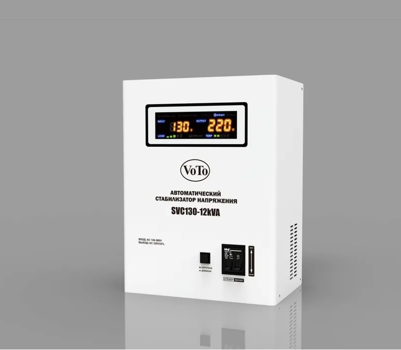 SVC130 - 12 кВА - стабилизатор электромеханического типа (сервоприводный ) обладающий хорошей плавностью и точностью выходного напряжения. Данная модель может работать в условиях отклонения входного напряжения в диапазоне от 130 до 260 Вольт, что на порядок шире чем у конкурентов данного типа. Стабилизатор обладает информативным дисплеем и компактным настенным корпусом. Данная модель отличное решение для защиты дома, квартиры или другого жилого помещения от некачественной питающей сети. Может использоваться в трехфазной сети при подключении 3-х стабилизаторов на каждую фазу. Количество фаз: Однофазный Максимальная мощность: 12000 ВА Рабочий диапазон: 130-260 В Выходное напряжение: 220 ± 3% Рабочая частота: 50-60 Гц Влажность: не более 80% Защита от повышенной нагрузки: Присутствует Защита от повышенного напряжения: Присутствует Защита от пониженного напряжения: Присутствует Защита от короткого замыкания: Присутствует Термозащита трансформатора: Присутствует Тип размещения: Напольное + настенное крепление Габаритные размеры: 480х350х210 Вес: 26 кг Преимущества: плавность регулирования и отсутствие скачков напряжения; отсутствие искажений формы сигнала; высокая точность выходного напряжения; широкий диапазон стабилизации входного напряжения; компактные размеры.