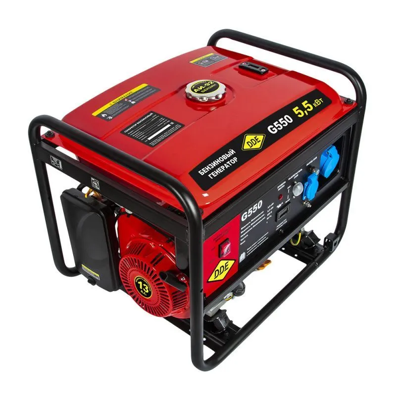 Бензиновый генератор ДДЕ G550 - это надежное и мощное устройство, которое обеспечит независимое электроснабжение в любых условиях. Он идеально подходит для использования на даче, в походе, на строительной площадке или в случае аварийного отключения электричества. Созданный с использованием передовых технологий, генератор обладает высокой производительностью и долговечностью. Его мощный двигатель обеспечивает стабильную работу и высокую эффективность, а специальная система охлаждения предотвращает перегрев и продлевает срок службы устройства. Характеристики Двигатель DDE Модель двигателя SC188F Тип двигателя: бензиновый, 4-х тактный Электродвигатель синхронный Объем двигателя, куб.см. 389 Кол-во цилиндров двигателя 1 Мощность двигателя, л.с. 13 Мощность двигателя, Вт. 8200 Количество фаз: однофазный Запуск: ручной Запуск электростартера: ручной стартер Тип масла 4-х тактное 10W-40 Расход топлива, л/час: при 75% - 2,63 Время непрерывной работы, ч 9,5 Емкость топливного бака, л. 25 Рекомендуемое топливо: АИ-92 Емкость картера двигателя, л. 1,1 Датчик уровня масла датчик уровня Вращение двигателя, об./мин. 3600 Охлаждение воздушное Класс защиты IP23 Уровень шума, Дб. 97 Тип оборудования синхронный Высоковольтная защита, В есть Мощность электроустановки на фазу max, Вт 5500 Мощность электроустановки на фазу nom, Вт. 5000 Кол-во розеток 380/220/12 В: -/2/- Розетки, шт.-В/А: 1х220/16А, 1х220/32А Защита от перегрева: нет Объем масляной емкости, л. 1,1 Коэффициент мощности, cos 1.0 Исполнение: открытый Габаритные размеры и вес Длина, мм 645 Ширина, мм 540 Общая высота, мм 590 Габаритные размеры, мм 645х540х590 Габариты упаковки, cм 70х60х60 Упаковка картонная коробка Вес, кг. 80 Комплектация: генератор, свечной ключ, инструкция на русском языке, гарантийный талон, упаковка Генератор DDE G550 оснащен удобной панелью управления, которая позволяет легко включать и выключать устройство, а также регулировать мощность генерируемого электричества. Благодаря этому, вы сможете эффективно использовать генератор в зависимости от ваших потребностей. Большой объем топливного бака позволяет генератору работать продолжительное время без необходимости дозаправки. Это особенно важно в случае длительных отключений электричества или при использовании генератора в удаленных местах, где доступ к топливу ограничен. Генератор DDE G550 обладает компактными размерами и небольшим весом, что делает его удобным в транспортировке и хранении. Вы сможете легко перемещать его с места на место, не испытывая лишних трудностей. Безопасность использования генератора обеспечивается рядом защитных систем, включая автоматическое отключение при перегрузке, низком уровне масла или высокой температуре. Это гарантирует безопасность как для устройства, так и для пользователей.