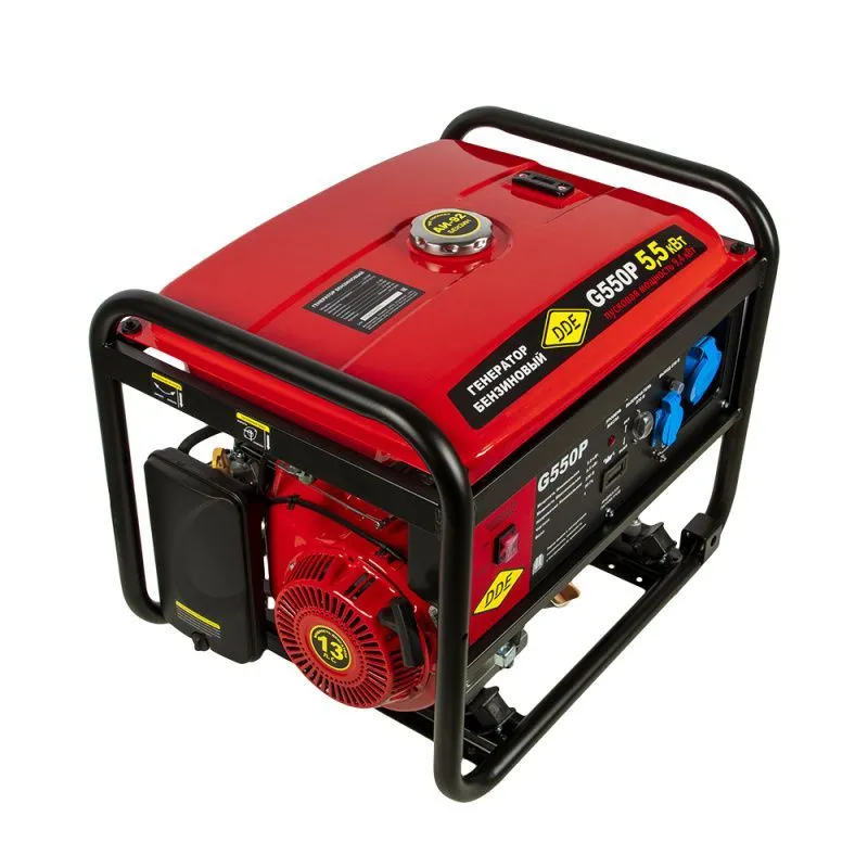 Бензиновый генератор DDE G550P 1ф 5,0/5,5/9,4 кВт бак 25 л двигатель 13 лc 919-990 применяется в качестве источника резервного питания. Агрегат подойдет для эксплуатации на даче, в загородном доме, вдали от центрального электроснабжения. Генератор имеет компактный корпус, оснащен вместительным топливным баком. Характеристики Тип двигателя: бензиновый, 4-х тактный Электродвигатель синхронный Мощность двигателя, л.с. 13 Мощность двигателя, Вт. 9400 Количество фаз: однофазный Тип масла 4-х тактное 10W-40 Рекомендуемое топливо АИ-92 Охлаждение воздушное Класс защиты IP23 Тип оборудования синхронный Высоковольтная защита, В: Нет Мощность электроустановки на фазу max, Вт 9400 Мощность электроустановки на фазу nom, Вт. 5000 Защита от перегрева: нет Коэффициент мощности, cos 1.0 Комплектация: инструкция на русском языке, гарантийный талон, упаковка