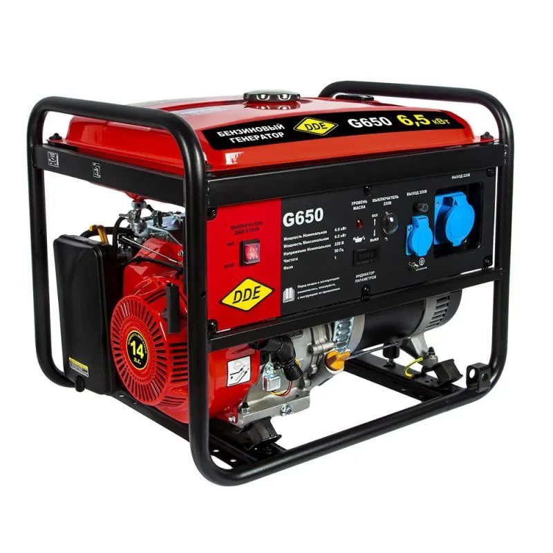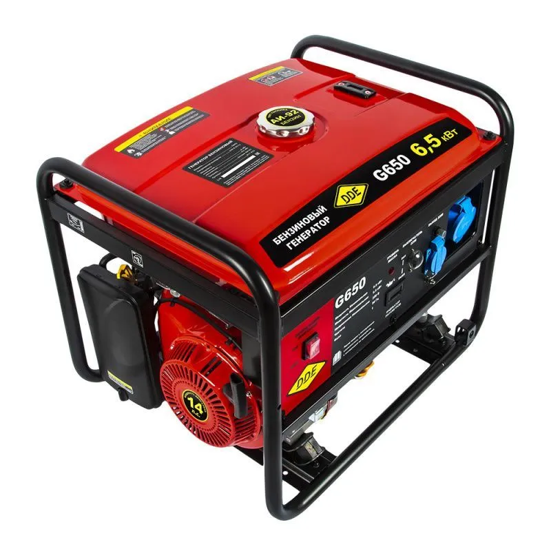 Бензиновый генератор ДДЕ G650 - это надежное и мощное устройство, которое обеспечит непрерывное электроснабжение в любых условиях. Он идеально подходит для использования на даче, в загородном доме, на строительных площадках или в экстренных ситуациях. Бензиновый генератор DDE G650 - это надежное и удобное устройство, которое обеспечит непрерывное электроснабжение в любых условиях. Приобретая его, вы получаете надежность, мощность и удобство в одном компактном устройстве. Характеристики Двигатель DDE Модель двигателя SC190F Тип двигателя: бензиновый, 4-х тактный Электродвигатель синхронный Объем двигателя, куб.см. 420 Кол-во цилиндров двигателя 1 Мощность двигателя, л.с. 14 Мощность двигателя, Вт. 9000 Диапазон рабочего напряжения, В 210-230/50 Количество фаз: однофазный Запуск: ручной Запуск электростартера: ручной стартер Тип масла 4-х тактное 10W-40 Расход топлива, л/час: при 75% - 2,78 Время непрерывной работы, ч 9 Емкость топливного бака, л. 25 Рекомендуемое топливо АИ-92 Емкость картера двигателя, л. 1,1 Датчик уровня масла Вращение двигателя, об./мин. 3600 Охлаждение воздушное Класс защиты IP23 Уровень шума, Дб. 97 Тип оборудования синхронный Высоковольтная защита, В есть Мощность электроустановки на фазу max, Вт 6500 Мощность электроустановки на фазу nom, Вт. 6000 Кол-во розеток 380/220/12 В: -/2/- Розетки, шт.-В/А 1х220/16А, 1х220/32А Защита от перегрева нет Объем масляной емкости, л. 1,1 Коэффициент мощности, cos 1.0 Исполнение открытый Габаритные размеры и вес Длина, мм 695 Ширина, мм 540 Общая высота, мм 590 Габаритные размеры, мм 695х540х590 Габариты упакови, cм 70х60х60 Упаковка: картонная коробка Вес, кг. 81 Комплектация: генератор, свечной ключ, вилка 32А, инструкция на русском языке, гарантийный талон, упаковка С максимальной мощностью 6500 Вт и номинальной мощностью 6000 Вт, генератор способен обеспечить стабильное питание для основных электроприборов, таких как холодильник, телевизор, компьютер или осветительные приборы. Благодаря своей компактности и легкости, генератор DDE G650 легко переносится и устанавливается в нужном месте. Он оснащен ручкой для удобной транспортировки. Комплектуется также автоматической поддержной напряжения, который защищает подключенные приборы от возможных скачков напряжения. Двигатель генератора работает на бензине и имеет емкость топливного бака 25 литров. Это обеспечивает длительное время работы генератора без необходимости частого заправления. Благодаря низкому уровню шума и вибрации, генератор работает практически бесшумно, что делает его идеальным выбором для использования в жилых зонах. Генератор оснащен автоматической системой защиты от перегрузки, что предотвращает повреждение генератора и подключенных приборов в случае превышения номинальной мощности. Также он имеет функцию автоматического отключения при низком уровне масла, что обеспечивает безопасную эксплуатацию и продлевает срок службы генератора.