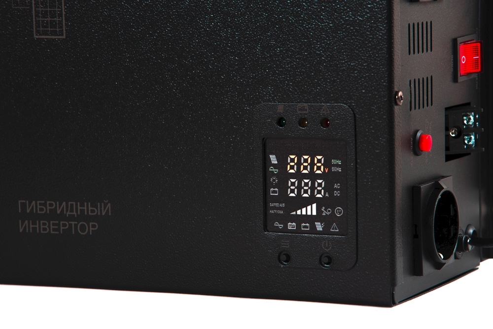 Инвертор предназначен для непрерывной подачи энергии от фотоэлектрических модулей, аккумулятора или городской сети. Способен одновременно питать нагрузку и заряжать аккумуляторы, если достаточно вырабатываемой мощности от солнечных панелей. Имеет удобный светодиодный дисплей и кнопки управления для установки различных режимов работы. Оптимальный диапазон входных напряжений от солнечных панелей позволяет использовать любой тип фотоэлектрических модулей. Технические характеристики: Мощность номинальная, ВА/Вт: 800/500 Напряжение АКБ, В: 12 Максимальная мощность подключаемых солнечных батарей, Вт: 500 Диапазон входного напряжения от солнечных батарей, В: 15...50 Ток заряда АКБ: от солнечных панелей, A: до 20, от сети 220В, A: до 10 Входное напряжение в режиме работы от сети, В: 140..275 Выходное напряжение в режиме работы от сети, В: 195...240 Выходное напряжение в режиме работы инвертора, В: 220 В +-3% Условия эксплуатации: Температура, °С: 040, Влажность, не более, %: 90, Температура хранения, °С: -15+45 Габариты: Без упаковки: 260х260х155, В упаковке: 350х325х215 Вес, кг: 6,3 Особенности: Online; встроенный MPPT контроллер заряда от солнечных батарей с поиском точки максимальной мощности; несколько режимов работы: параллельно с сетью, автономно, параллельно с сетью в режиме резервного источника питания; защита от короткого замыкания и перегрузки; автоматический перезапуск при восстановлении питания переменного тока; дисплей отображает всю основную информацию о работе системы; контроль от глубокого разряда и перезаряда АКБ; программное обеспечение по мониторингу солнечной электростанции; выбор приоритета питания нагрузки.