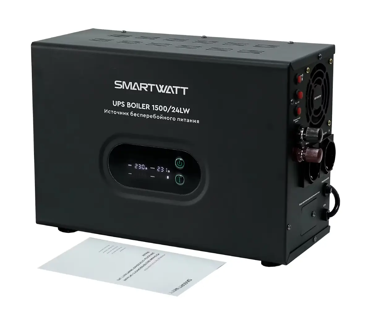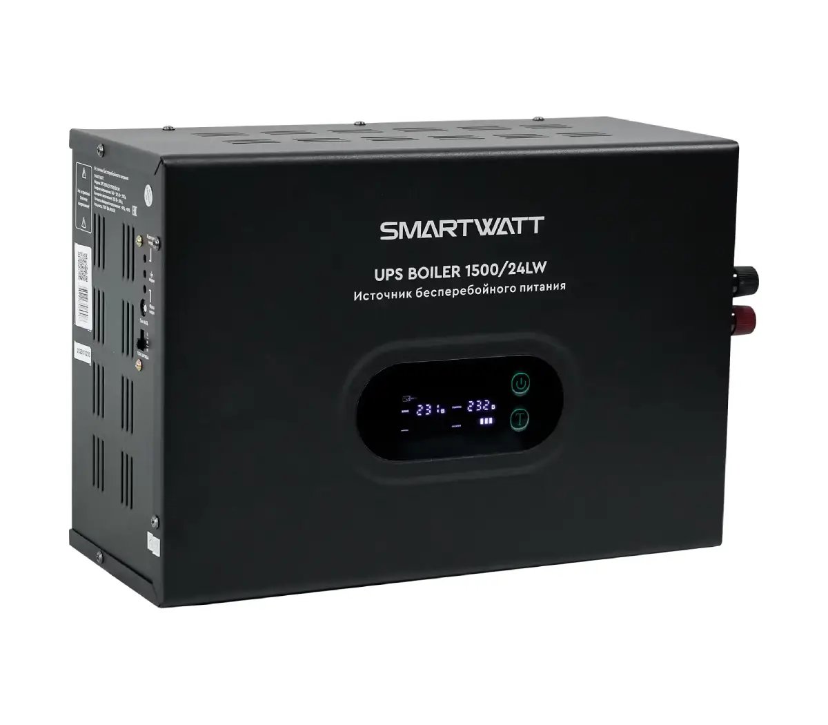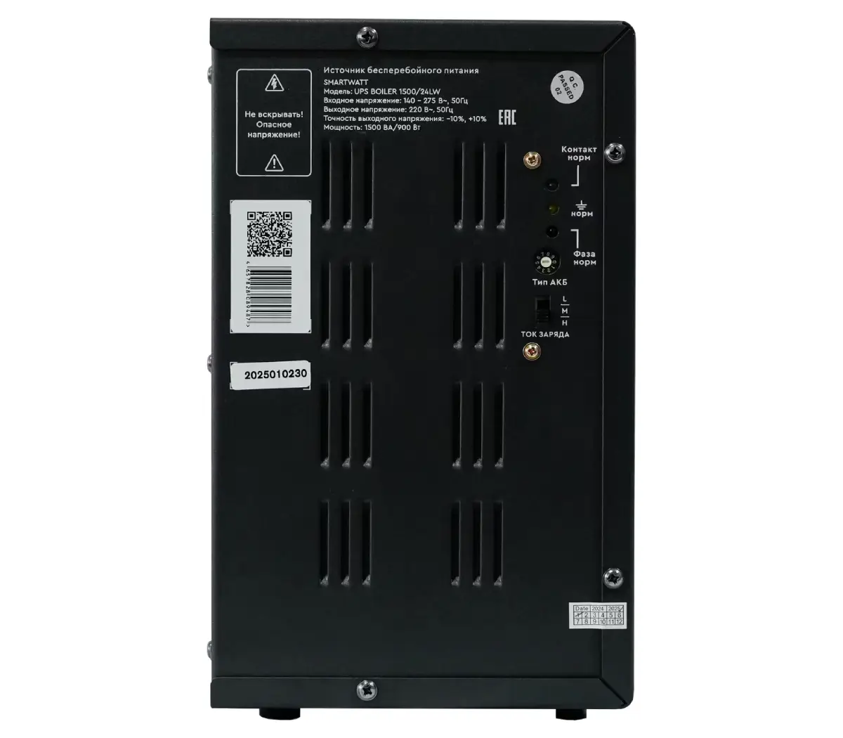 Источники бесперебойного питания SMARTWATT BOILER поддерживают режим продления времени заряда и обеспечивают быстрое переключение на резерв. Устройства показывают реальное время автономной работы системы отопления. Функция «прерывистый режим» увеличивает его в 3 раза. Индикация фазировки и «сквозная нейтраль» позволяет работать с прихотливыми фазозависимыми котлами. Серия: SMARTWATT UPS BOILER Технология: Линейно-интерактивные SIN Макс. полная мощность, ВА: 1500 Мощность, Вт: 900 Перегрузка: 120% Диапазон частот от: 50 Типология: Однофазные Номинальное выходное напряжение, В: 220 +/-10% Входной сигнал переменного тока от: 140 Входной сигнал переменного тока до: 275 Количество розеток (тип Schuko): 2 Количество розеток с резервированием, шт: 2 Подключение внешних АКБ: Да Количество АКБ, шт: 2 Выходная частота (работа от батареи), Гц: 50 Выходной коэффициент мощности: 0.6 Время переключения на АКБ, макс. мс: 4 Ток заряда АКБ, А: 15 Температура эксплуатации от, °С: -10 Температура эксплуатации до, °С: 40 Относительная влажность от, %: 10 Относительная влажность до, %: 90 Уровень шума, дБ: 56 Интерфейс индикации: LED индикация Габариты ДхШхВ, мм: 410x270x170 Вес, кг: 10.45 Линейно-интерактивные ИБП SMARTWATT BOILER для отопительного оборудования. Преимущества: Чистый синус Встроенный стабилизатор Быстрое переключение на резерв Сквозная нейтраль Совместимость с генераторами Проверка правильности фазировки Большой зарядный ток LED-дисплей Тестирование АКБ Расширенная гарантия