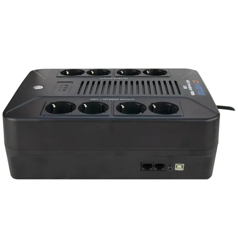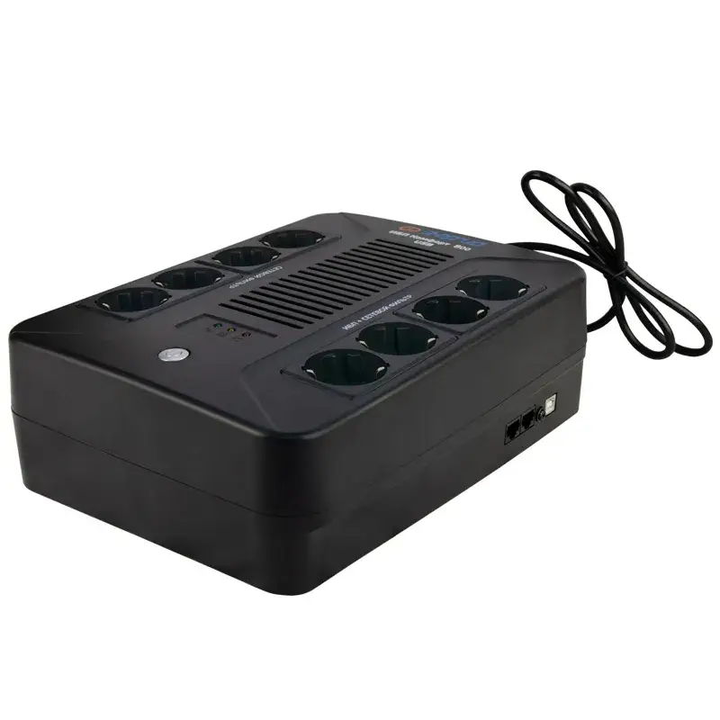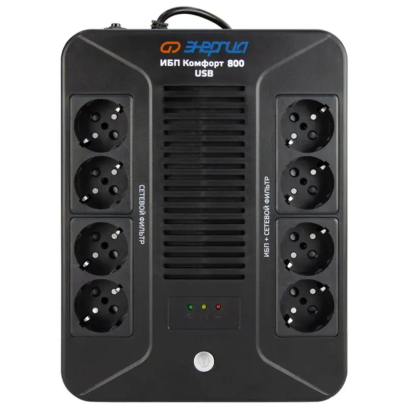 ИБП Комфорт 800 USB Энергия - это незаменимый помощник для защиты компьютерной и офисной техники, включая ПК, ноутбуки, экраны, а также модемы и маршрутизаторы, от внезапных скачков напряжения и обеспечения их энергией. Отличительная особенность этой модели по сравнению с предыдущими - возможность мониторинга работы устройства через USB-соединение. Это позволяет подключать его к персональному компьютеру или ноутбуку для управления режимами включения и выключения устройства, совместимо с операционными системами Windows XP до Windows 11. Программное обеспечение для этой функции доступно на официальном сайте производителя, с инструкциями по установке. Название модели ИБП Энергия Комфорт 800 USB Артикул Е0201-1004 Номинальная мощность, ВА|Вт 800|480 Тип ИБП линейно-интерактивный Напряжение (входящее) В 170-280 Номинальное выходное напряжение, В 220 Точность стабилизации, % 10 Диапазон выходного напряжения, В 198-242 Частота, Гц 50 Форма напряжения Модифицированная синусоида при работе от батареи Время переключения на работу от батареи, мс 2-8 Установленные батареи Внутренняя AGM 1 шт. 12В-8 А·ч Время заряда до 90% заряда, час 6-8 Время работы от батарей 2-10 минут Входная цепь Сетевой шнур с вилкой «Schuko» 1м Выходная цепь Розетка «Schuko» 8 шт.: 4 с питанием от батареи и стабилизацией, 4 в режиме сетевого фильтра Защита модема, роутера, локальной сети 2 порта RJ45 (вход-выход) Порты и интерфейсы USB Type-B для мониторинга (Windows XP,Vista,7,8,10,11) Напряжение батареи В 12 Габариты мм 94 х 205 х 285 Вес кг 5,5 ЗВУКОВАЯ ИНДИКАЦИЯ При отключении сетевого питания включается короткий звуковой сигнал 1 раз в 6 секунд на протяжении 40 секунд. При разряженной батарее звуковой сигнал подается раз в 2 секунды. При критическом разряде батареи сигнал становится непрерывным. Форма выходного сигнала модифицированная синусоида.