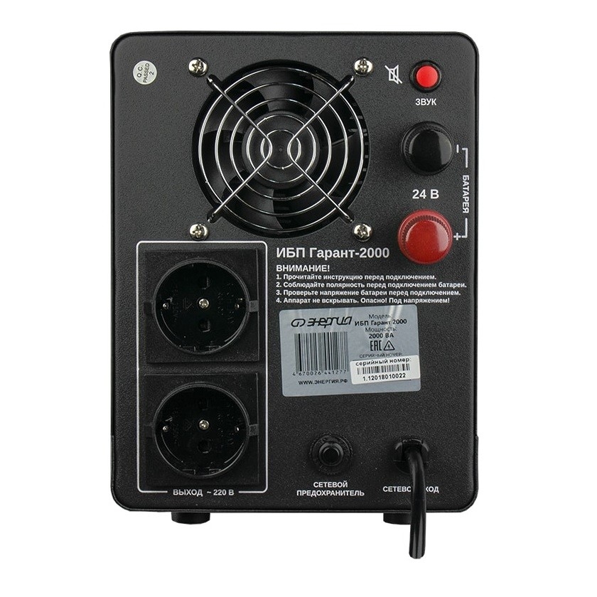 Мощный инвертор под нагрузку до 1200 Вт. Генерирует неискаженную синусоиду, полностью автоматизирован, прост в подключении и эксплуатации. В данном аппарате совмещены преобразователь напряжения, стабилизатор и зарядное устройство. Инверторы «Энергия» серии ИБП Гарант заряжают аккумулятор в момент присутствия сети. При полном пропадании питания прибор находится в режиме преобразователя постоянного сигнала в переменный (инверторный режим). Он преобразует постоянное напряжение аккумуляторной батареи в переменное напряжение 220 Вольт, которое подается к потребителям. При появлении напряжения в сети происходит переключение прибора из инверторного режима в режим стабилизации. Он начинает работать как стабилизатор напряжения релейного типа с диапазоном входных напряжений 155-275 Вольт и с точностью 220±10%. Одновременно с этим происходит зарядка аккумуляторной батареи. В инверторном режиме прибор потребляет энергию подключенного к нему аккумулятора. Тип инвертора: Line-interactive Способ установки: Напольный Форма напряжения: Чистая синусоида Число фаз: Одна Максимальная мощность (ВА): 2000 Пик-фактор: 3:1 Наличие стабилизатора: Есть, автотрансформатор с релейными ключами Величина постоянного напряжения (В): 24 Количество 12 вольтовых аккумуляторов необходимых для работы: 2 Функция заряда аккумулятора: Есть Ток заряда аккумуляторов (А): От 10 до 15 Рабочий диапазон входного напряжения сети (В): 155-275 Выходное напряжение при питании от сети (В): 220 ±10% Выходное напряжение при питании от батарей (В): 220 ±1% Частота выходного напряжения (Гц): 50 Защита от перегрузки до 120% от мощности: 30 секунд работы Защита от перегрузки больше 120% от мощности: 2 секунды работы Защита от перегрузки больше 260% от мощности: Мгновенное отключение Защита от перегрева, больше 120°C: Отключение Защита по току: Автоматический выключатель Защита от повышенного напряжения, с переходом на работу от аккумулятора (В): 285 Защита от пониженного напряжения, с переходом на работу от аккумуляторов (В): 120 Защита от полного разряда батареи: Есть Защита от перезаряда батареи: Есть Защита от перегрузки и короткого замыкания: Есть Время переключения режимов работы: Не более 8 мс КПД (%): 98 Индикация параметров работы: LED-дисплей (многофункциональный) Способ охлаждения: Естественная циркуляция воздуха и работа вентилятора Подключение к сети: Cетевой кабель с вилкой Подключение нагрузки к инвертору: Розетка 220 Вольт Подключение аккумулятора к инвертору: Клеммы Температура эксплуатации (°C): -5...+40 Температура хранения (°C): -15...+45 Относительная влажность: 98% Габаритные размеры (мм): 210х160х340 Вес (кг): 8,9 Вес брутто (кг): 9,7 Производитель: Энергия Cтрана производства: Россия Гарантия: 12 месяцев Расчетный срок службы: 10 лет Инверторные преобразователи постоянного напряжение в переменное со встроенным релейным однофазным стабилизатором напряжения серии ИБП Гарант это устройства, способные обеспечить электроприборам не только стабильное напряжение, но и бесперебойное и даже более качественное электроснабжение потребителей в случаях полного отключения питания. Так как точность выходного напряжения при работе от АКБ 220±3%, и на выходе чистая синусоида. Инверторы «Энергия» серии ИБП Гарант подключаются к внешнему аккумулятору. Используется 12 и 24 вольтовые аккумуляторной батареи, в зависимости от модели ИБП. Испо