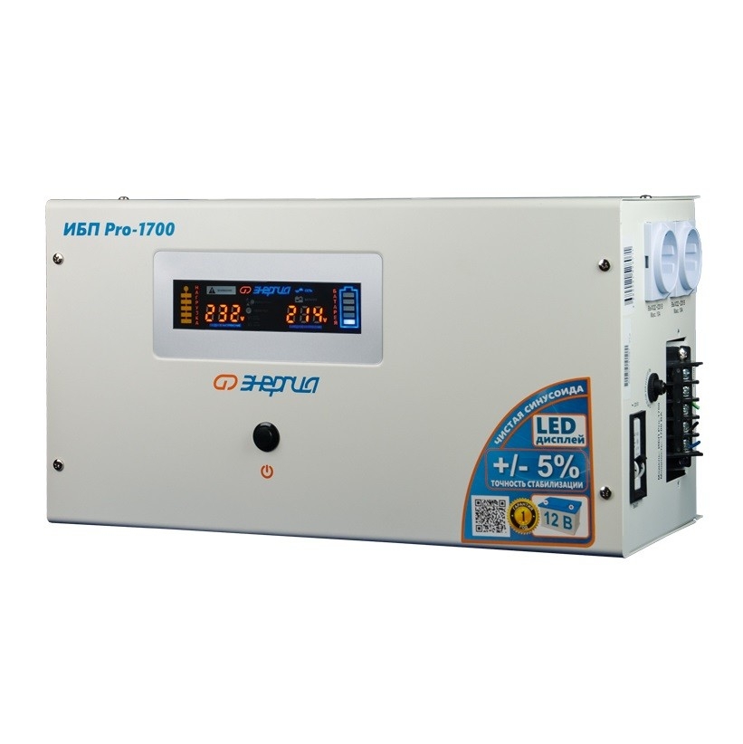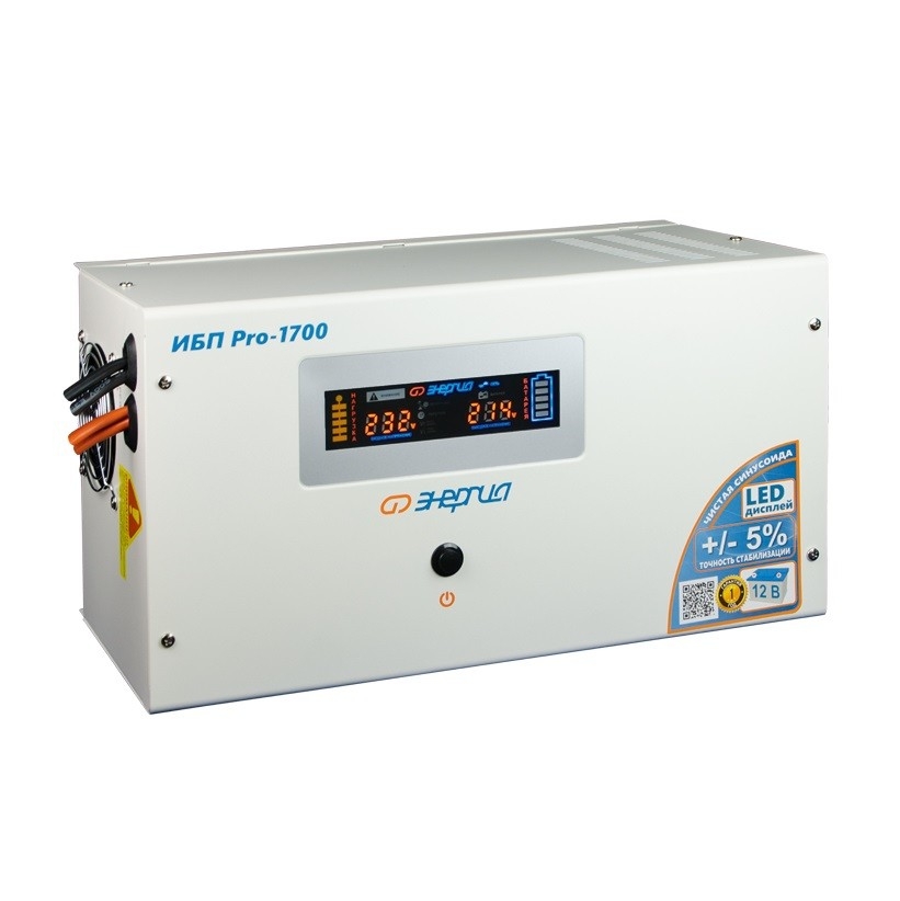 ИБП Pro-1700 12 В - новинка от ЭТК Энергия. Достаточно мощный преобразователь напряжения. Выдерживает нагрузку до 1,2 кВт. При этом, в отличии от аналогичных моделей других производителей, требует подключения всего лишь одного 12-ти вольтового аккумулятора, что существенно экономит бюджет при покупке. Работает в режиме Line-interactive. Тип инвертора: Line-interactive Способ установки: Настенный, Напольный Форма напряжения: Чистая синусоида Число фаз: Одна Максимальная мощность (ВА): 1700 Пик-фактор: 3:1 Наличие стабилизатора: Есть, автотрансформатор с релейными ключами Величина постоянного напряжения (В): 12 Количество 12 вольтовых аккумуляторов необходимых для работы: 1 Функция заряда аккумулятора: Есть Ток заряда аккумуляторов (А): 20 (Автоматически регулируется от 0 до 20А) Рабочий диапазон входного напряжения сети (В): 170-280 Выходное напряжение при питании от сети (В): 220 ±5% Выходное напряжение при питании от батарей (В): 220 ±1% Частота выходного напряжения (Гц): 50 Порог защиты от перегрузки по мощности (откл 60с) (%): 120 Порог защиты от перегрузки по мощности в инверторном режиме (откл 30с) (%): 130 Порог защиты от перегрузки по мощности в инверторном режиме (откл 3с) (%): 300 Защита от перегрева, больше 120°C: Отключение Защита по току: Автоматический выключатель Защита от повышенного напряжения, с переходом на работу от аккумулятора (В): 280 Защита от пониженного напряжения, с переходом на работу от аккумуляторов (В): 170 Защита от полного разряда батареи: Есть Защита от перезаряда батареи: Есть Защита от перегрузки и короткого замыкания: Есть Время переключения режимов работы: Не более 6 мс КПД (%): 98 Индикация параметров работы: Светодиодный дисплей Способ охлаждения: Естественная циркуляция воздуха и работа вентилятора Подключение к сети: Клеммная колодка Подключение нагрузки к инвертору: Розетка 220 Вольт, Клеммная колодка Подключение аккумулятора к инвертору: Провода с винтовыми клеммами под винт М6 (70 см) Температура эксплуатации (°C): -5...+40 Температура хранения (°C): -15...+45 Относительная влажность: 98% Производитель: Энергия Cтрана производства: Россия Гарантия: 12 месяцев Расчетный срок службы: 10 лет Габаритные размеры (мм): 505x305x270 Вес (кг): 13,5