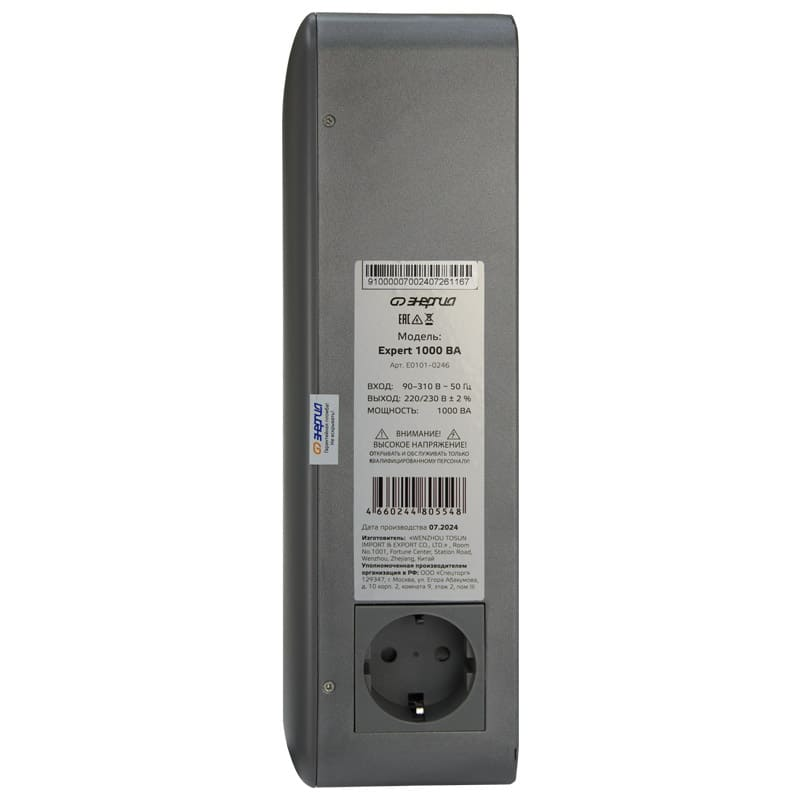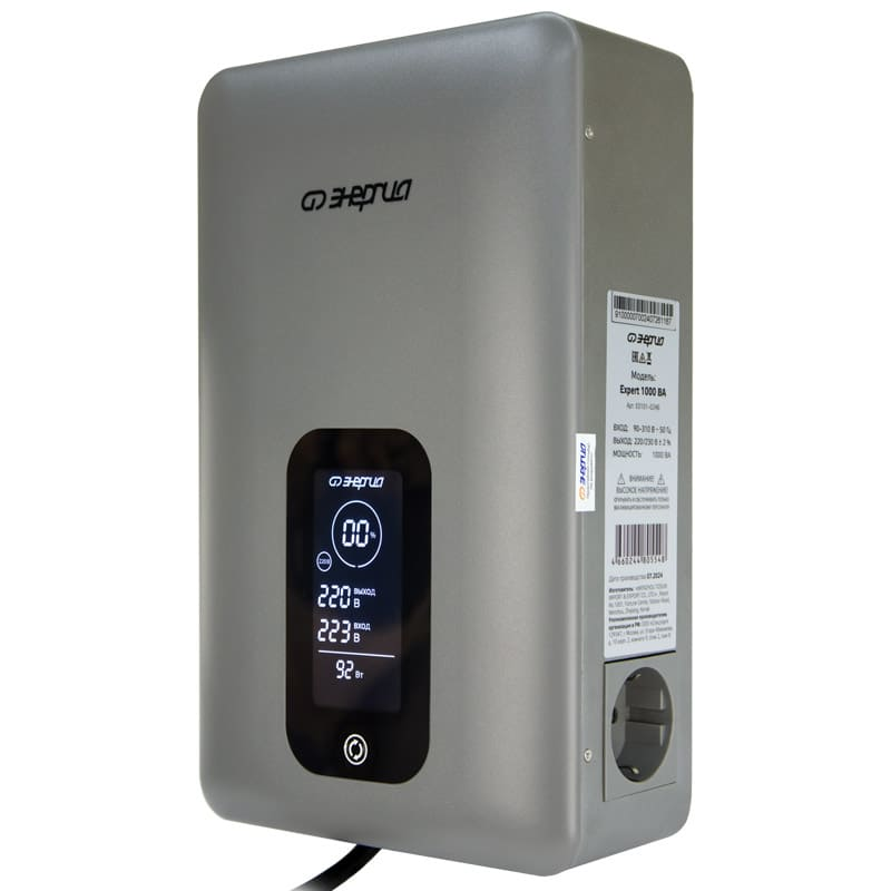 Стабилизатор напряжения Энергия Expert 1000 это надежное устройство для обеспечения стабильного однофазного питания. Основной принцип его работы двойное преобразование входного сигнала, что позволяет достигать высокой точности выходного напряжения (до ±2%). Этот стабилизатор способен поддерживать постоянное напряжение при колебаниях в сети от 90 до 310 В, делая его отличным выбором для защиты техники от скачков напряжения. Максимальная мощность нагрузки, ВА: 1 000 Максимальная мощность нагрузки, Вт: 800 Тип входного напряжения: Однофазный Рабочий диапазон входных напряжений (В): от 90 до 310 Отклонение выходных напряжений: ±2% Принцип стабилизации: Двойного преобразования Принцип работы стабилизатора: Инверторный Режим работы: Непрерывный Вариант установки: Настенный / Настольный Предельный диапазон входных напряжений (В): от 90 до 310 Номинальная частота переменного тока, Гц: 50 Максимальный ток на входе, А: 5,2 Выходное напряжение, В: 220/230 Рабочий диапазон выходных напряжений, В: 216224 / 226235 Допускаемая перегрузка: до 150% Время переключения режимов работы: 0 мс КПД (%): не менее 97 Защита от пониженного напряжения, откл. при: 90В Защита от повышенного напряжения, откл. при: 310В Защита от перегрева трансформатора, откл. при: 120 °С Защита от перегрузки по току: Автоматический выключатель Вид входной цепи: Сетевой кабель с вилкой типа F - 1,5м Вид выходной цепи: 1 розетка типа F Дисплей: LED-дисплей Индикация: Входное напряжение / Выходное напряжение Температура хранения, °С: -40...+45 Относительная влажность, %: 90 (при 35°С) Способ охлаждения: Воздушное конвекционное Степень защиты, IP: IP20 Рабочая температура, °С: -5...+40 Вес нетто (кг): 2,5 Габаритные размеры нетто (мм): 87*173*280 Вес брутто (кг): 2,9 Стабилизатор разработан для работы с промышленными нагрузками при частоте 50 Гц и мощности до 1000 ВА. Он имеет светодиодный индикатор, который отображает режимы работы, включая состояние нагрузки и перегрузки. Установка стабилизатора возможна как на пол, так и на стену, что облегчает его размещение в ограниченном пространстве. Модель оснащена встроенной защитой от перегрева, перегрузки и короткого замыкания. Максимальная выходная мощность достигает 150% при допустимой перегрузке, а время переключения составляет 0 мс, что обеспечивает мгновенную стабилизацию. Высокий КПД (до 97%) и автоматическая система защиты делают стабилизатор идеальным выбором для надежного электропитания, продлевая срок службы подключенного оборудования. Этот стабилизатор требует минимального обслуживания и прост в эксплуатации, что делает его удобным решением для использования в различных сферах.