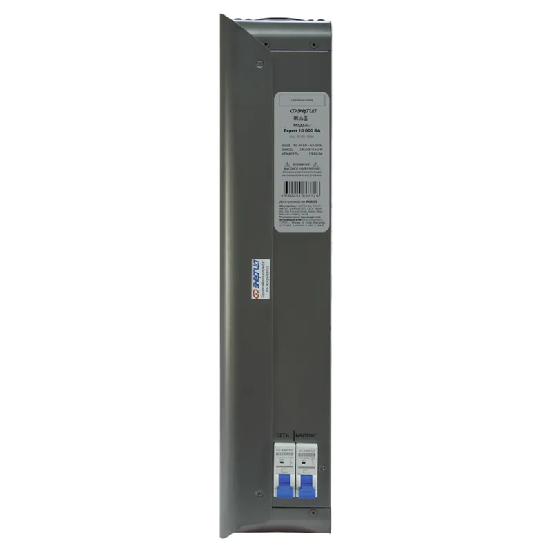 Основным отличием стабилизатора напряжения Энергия Expert от других видов стабилизаторов является принцип действия это двойное преобразование электроэнергии. Выпрямитель на входе преобразует нестабильное сетевое напряжение в постоянное, а затем на выходе инвертор преобразует его снова в переменное с идеальным синусом и максимальной точностью ±2%. Регулировка напряжения происходит мгновенно, без малейших задержек. Максимальная мощность нагрузки, ВА | Вт: 10000 | 9000 Номинальное выходное напряжение, В: 220 или 230 Диапазон входного напряжения, В: 90-310 Номинальная частота переменного тока, Гц: 43 - 57 Точность стабилизации: ±2% Тип выходного сигнала: Чистая синусоида Диапазон выходного напряжения, В: 216224 / 226235 Защита от повышенного напряжения, откл. при: Uвх. 310В Защита от пониженного напряжения, откл. при: Uвх. 90В Защита от перегрева, откл. при t: 120 °С Время переключения, мс: 0 (мгновенная стабилизация напряжения) Способ охлаждения: Воздушное конвекционное и принудительное Входная цепь: Клеммная колодка Выходная цепь: Клеммная колодка Допускаемая кратковременная перегрузка в течение 10 минут, не более (%): 150 Коэффициент полезного действия, %: 97 Индикация: Норма, перегрузка| перегрев, напряжение меньше 90, напряжение больше 310 Режим работы: Непрерывный Крепление: Универсальное Степень защиты от внешних воздействий по ГОСТ 14254-96: IP20 Условия эксплуатации: эксплуатации, °С: -5...+40; температура хранения, °С: -40...+40 Сроки службы и хранения: Назначенный срок службы изделия 10 лет. Гарантии изготовителя: Гарантийный срок эксплуатации изделия устанавливается в течении 36-ти календарных месяцев со дня продажи. Преимущества: Широкий диапазон рабочего входного напряжения: 90310 В; Высокая точность стабилизации ± 2%; Чистая синусоида; Мгновенное время срабатывания (отсутствует переключение контактов при регулировке); Бесшумная работа; Схема без использования трансформатора малый вес и компактные размеры; Универсальный способ установки (навесной или напольный); Гарантийный срок 3 года со дня продажи. Виды защиты: Защита от перегрузки по току; Тепловая защита; Защита от короткого замыкания; Защита от повышенного напряжения; Защита от пониженного напряжения