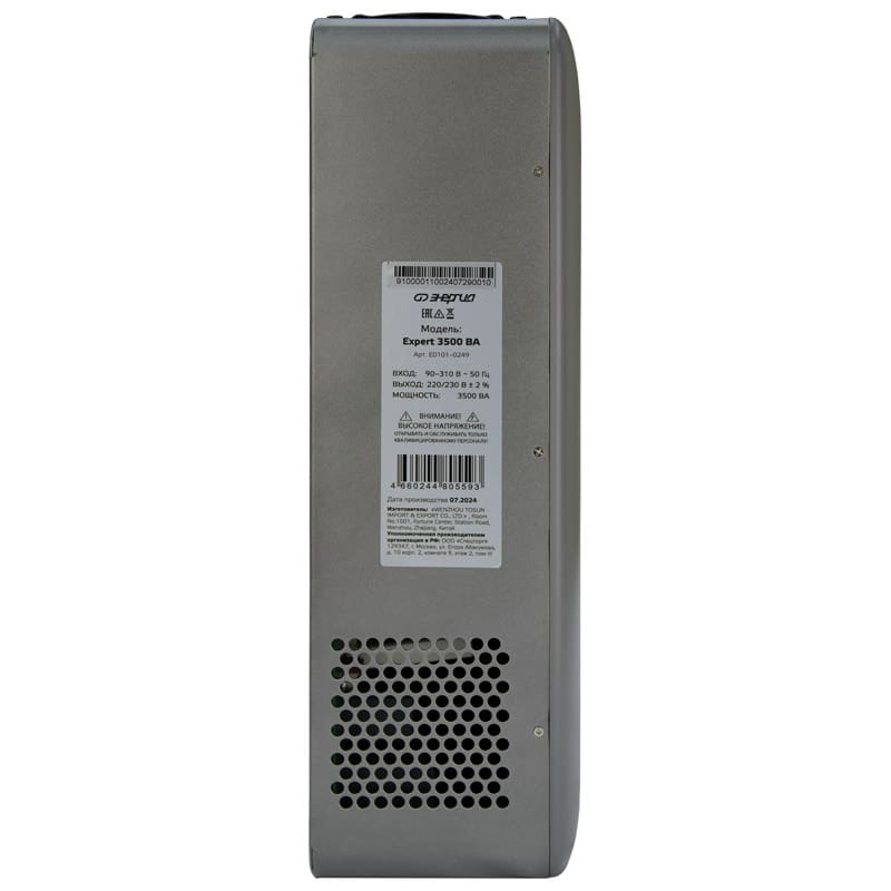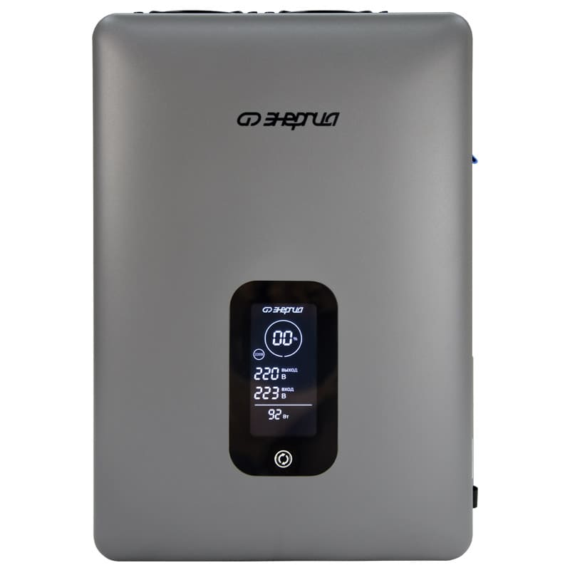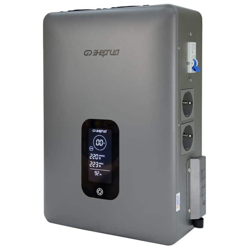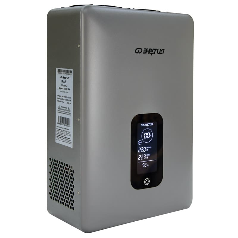 Основным отличием стабилизатора напряжения Энергия Expert от других видов стабилизаторов является принцип действия это двойное преобразование электроэнергии. Выпрямитель на входе преобразует нестабильное сетевое напряжение в постоянное, а затем на выходе инвертор преобразует его снова в переменное с идеальным синусом и максимальной точностью ±2%. Регулировка напряжения происходит мгновенно, без малейших задержек. Максимальная мощность нагрузки, ВА|Вт: 3500|2750 Номинальное выходное напряжение, В: 220 или 230 Диапазон входного напряжения, В: 90-310 Точность стабилизации: ±2% Тип выходного сигнала: чистая синусоида Диапазон выходного напряжения, В: 216224 / 226235 Защита от повышенного напряжения, откл. при: Uвх. 310В Защита от пониженного напряжения, откл. при: Uвх. 90В Защита от перегрева, откл. при t: 120 °С Время переключения, мс: 0 (мгновенная стабилизация напряжения) Способ охлаждения: воздушное конвекционное и принудительное Входная цепь: клеммная колодка Выходная цепь: 2 розетки + клеммная колодка Вес нетто, г: 4,5 Высота, мм: 105 Ширина, мм: 247 Глубина, мм: 350 Преимущества: Широкий диапазон рабочего входного напряжения: 90310 В; Высокая точность стабилизации ± 2%; Чистая синусоида; Мгновенное время срабатывания (отсутствует переключение контактов при регулировке); Бесшумная работа; Схема без использования трансформатора малый вес и компактные размеры; Универсальный способ установки (навесной или напольный); Гарантийный срок 3 года со дня продажи. Виды защиты: Защита от перегрузки по току Тепловая защита Защита от короткого замыкания Защита от повышенного напряжения Защита от пониженного напряжения
