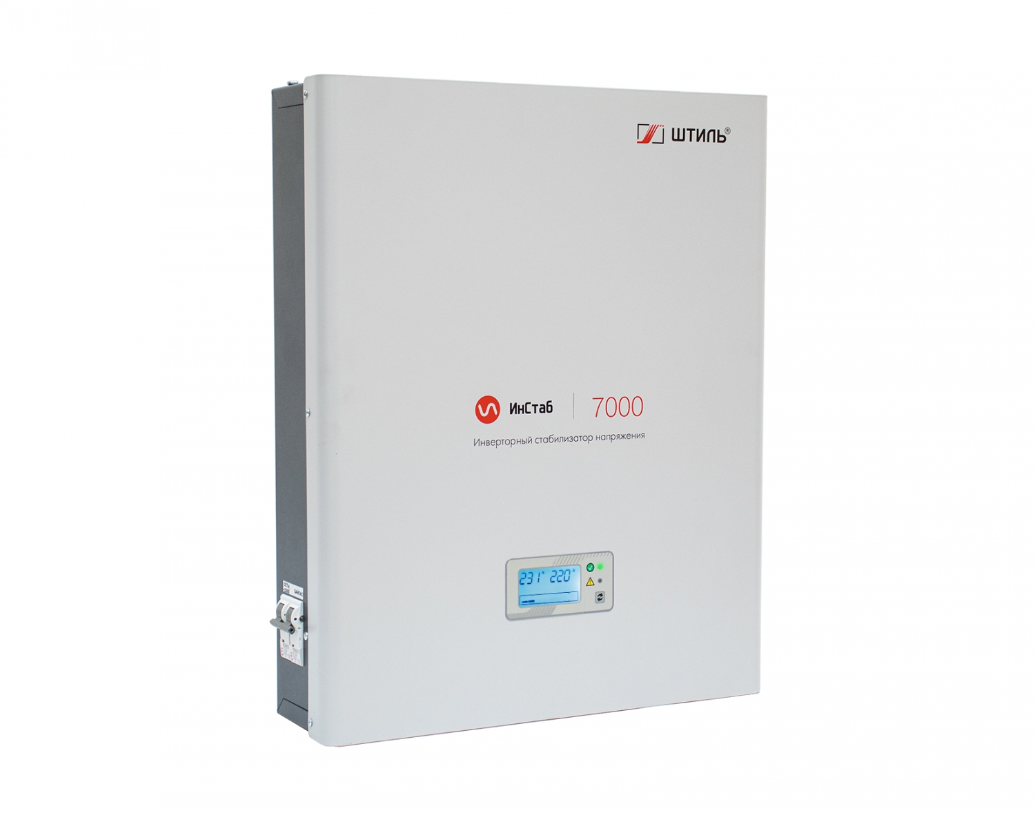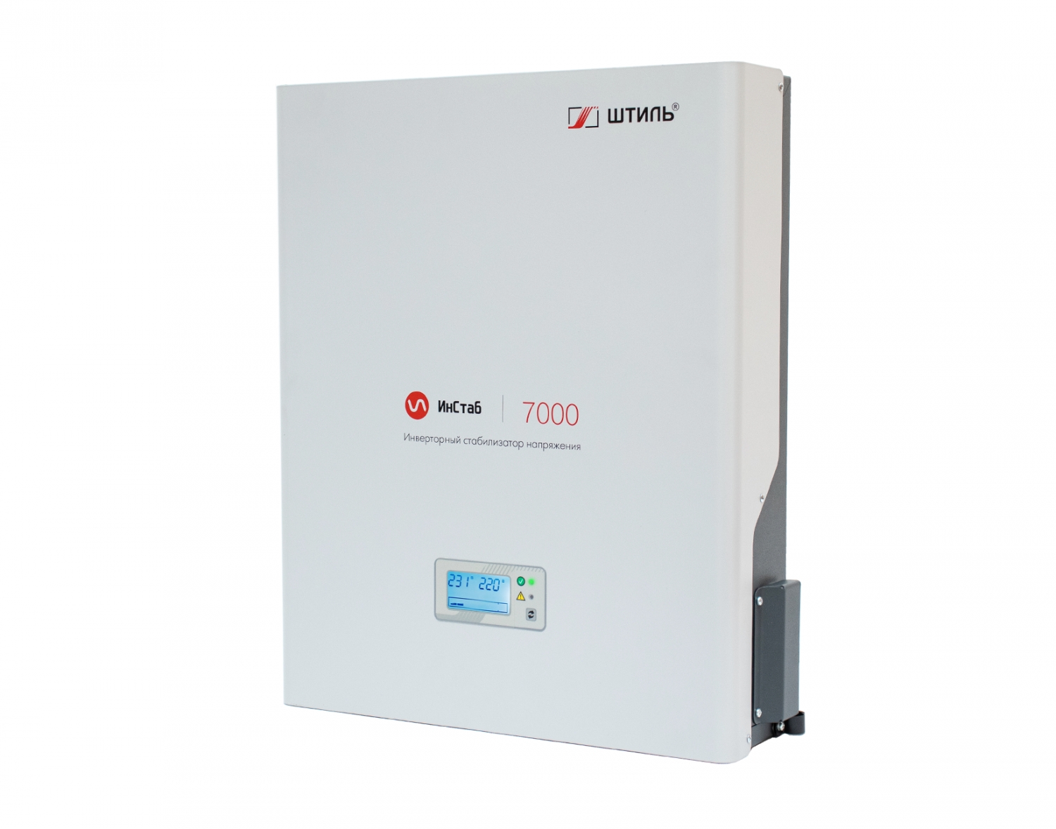 Инверторный стабилизатор напряжения "Штиль" обеспечивает наивысший уровень защиты оборудования по сравнению с другими типами стабилизаторов. Благодаря использованию технологии двойного преобразования (онлайн) этот стабилизатор имеет уникальные технические характеристики и потребительские свойства. Технические характеристики Число фаз: 1 Номинальное входное напряжение, В: 220 Максимальная мощность нагрузки, кВА: 7,0 Максимальная мощность нагрузки, кВт:: 5,0 Допустимая перегрузка: 150% не менее 5 сек Рабочий диапазон входного фазного напряжения, В: 90-310 Номинальная входная частота, Гц: 50 Диапазон входной частоты, Гц: 43-57 Номинальное выходное напряжение, В: 220/230/240 В (настраивается на заводе, стандартно 220 В) Стабилизация выходного фазного напряжения, %: 2 Рабочий диапазон выходного фазного напряжения, В: 216-224 КПД, %: 97 Диапазон изменения нагрузки, %: 0-100 Коэффициент мощности нагрузки: 0-1 (любой тип нагрузки) Климатическое исполнение: УХЛ 4.2 по ГОСТ 15150 Диапазон температуры окружающей среды, °С: +5 C ... +40 C Диапазон температуры окружающей среды при транспортировке и хранении, °С: -40 С ... +40 С, кроме самолетов. Относительная влажность воздуха, %: до 80% без конденсата Вид охлаждения: принудительное, интеллектуальное Степень защиты: IP20 Масса, кг: 9 Габаритные размеры (ШхВхГ), мм: 353 x 366 x 103 Гарантийный срок, мес: 24 Срок службы, лет: 10 Данная модель предназначена для защиты оборудования, мощность которого не превышающей 7000 ВA / 5000 Вт (автоматика котлов и других ответственных потребителей, СВЧ-печи, насосы, компрессоры, копировальные аппараты,телевизоры, аудио-видео техника, компьютеры, факсимильные аппараты, офисные АТС, медицинское оборудование, прецизионные измерительные приборы и т.д.) Конструктивные особенности однофазных инверторных стабилизаторов "Штиль" Бестрансформаторная схема двойного преобразования напряжения (онлайн) на современных IGBT-транзисторах с микропроцессорным управлением. Малый вес и габариты по сравнению с аналогами сопоставимой мощности. Синусоидальная форма выходного напряжения. Мгновенная реакция на изменение напряжения на входе. Отсутствие переходных процессов при скачках напряжения на входе. Широкий диапазон напряжения на входе и высокая точность стабилизации на выходе. Корректор мощности на входе. Независимо от характера нагрузки стабилизатор является для сети чисто активной нагрузкой и не вносит искажений в первичную сеть. Полная электронная защита нагрузки и самого стабилизатора от короткого замыкания, перегрузки, пониженного и повышенного напряжения на входе, перегрева. Фильтрация высокочастотных помех из первичной сети. Ручной байпас. Инверторный стабилизатор напряжения "Штиль" мощностью 7000 ВА / 5000 Вт выполнен в виде блока для настольного или настенного размещения с ЖК экраном на передней панели, автоматическим выключателем, клемной колодкой на боковой панели. При заказе стабилизатора, указывайте интересующую модификацию: с выходным напряжением 220 В или 230 В. При заказе стабилизатора, указывайте интересующую модификацию: с выходным напряжением 220 В или 230 В.
