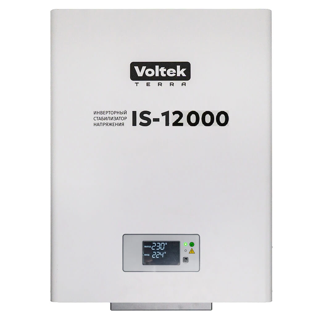 Стабилизатор напряжения Voltek IS предназначен для поддержания стабильного напряжения в однофазных электросетях 220В в соответствии с ГОСТ 13109-97. Стабилизатор обеспечивает защиту от повышенного и пониженного напряжения, электрических помех, высоковольтных скачков и провалов входного напряжения. Стабилизатор оснащен комплексом систем, обеспечивающим надежную защиту как потребителей, так и самого стабилизатора от любых нештатных ситуаций, и рассчитан на непрерывную круглосуточную работу в условиях больших по значению и длительности отклонений напряжения от номинального значения. Тип стабилизатора: Инверторный (с двойным преобразованием) Мощность: 12 кВА (9,612 кВт) Максимальный ток, А: 55 Напряжение входа, В: 90 - 310 Напряжение выхода, В: 220/230 ± 2% Частота сети, Гц: 4257 Скорость реакции: 0 (мгновенно) Байпас: Автоматический и ручной Подключение: Клеммная колодка (L, N, PE) Перегрузочная способность: 150% (не более 5 сек) Охлаждение: Конвекционное, принудительное Защита от повышенного напряжения: Электронная, при >310 В восстановление при <290 В Защита от пониженного напряжения: Электронная, при <90 В восстановление при >110 В Защита от перегрева: Электронная, с автоматическим восстановлением Защита от короткого замыкания: Электронная, с автоматическим восстановлением Защита от помех: до 2.5 кГц Потребление без нагрузки, Вт: 65 Ток холостого хода, А: 0.30 Температура эксплуатации, °С: -20+40 Температура хранения, °С: -30+60 Относительная влажность: < 80% (без образования кондесата) Класс защиты по ГОСТ 14254-96: IP20 Габариты (В×Ш×Г), мм: 495×360×100 Вес нетто, кг: 13 Габариты упаковки (В×Ш×Г), мм: 538×400×150 Вес брутто, кг: 15 Отличительные черты стабилизаторов Voltek серии IS: Инверторная технология. Технология двойного преобразования напряжения обеспечивает чистую синусоиду, абсолютную защиту от скачков и просадок напряжения. Чистая синусоида. Обеспечивают чистую синусоиду даже при наличии помех во входной линии. Отлично подходит для чувствительной техники. Высокая эффективность. Низкое собственное потребление и высокая энергоотдача. Меньше выделения тепла, меньше потери мощности. Выдерживают высокие пусковые токи. Перегрузочная способность до 150% для устройств с высокими пусковыми токами (насосы, станки, компрессоры и т.п.) Широкий диапазон входных напряжений. Работают в самых проблемных сетях. Стабилизируют напряжение при скачках до 310 В и просадках до 90 В. Высокая точность. Погрешность выходного напряжения всего 2%. Это точнее требований ГОСТ. Подходит для самых требовательных и чувствительных приборов. Полный спектр защитных систем. Защита от аномальных напряжений, перегрева, короткого замыкания и перегрузки. 100% защита как приборов, так и самого стабилизатора Подходят для любой нагрузки. Для бытового или промышленного применения. Одинаково хорошо работают с резистивной, индукционной, емкостной и смешанной нагрузкой По шкале нагрузки можно отслеживать текущую нагрузку на стабилизатор. Не рекомендуется использовать стабилизатор в условиях перегрузки по мощности. Следует помнить, что при пониженном напряжении в электросети эффективная мощность стабилизатора пропорционально снижается. Зависимость эффективной мощности стабилизатора от входного напряжения показана на следующем графике: Стабилизаторы IS-1000, IS-1500, IS-2000, IS-5000, IS-10000 и IS-15000 оснащены многофункциональным информаци