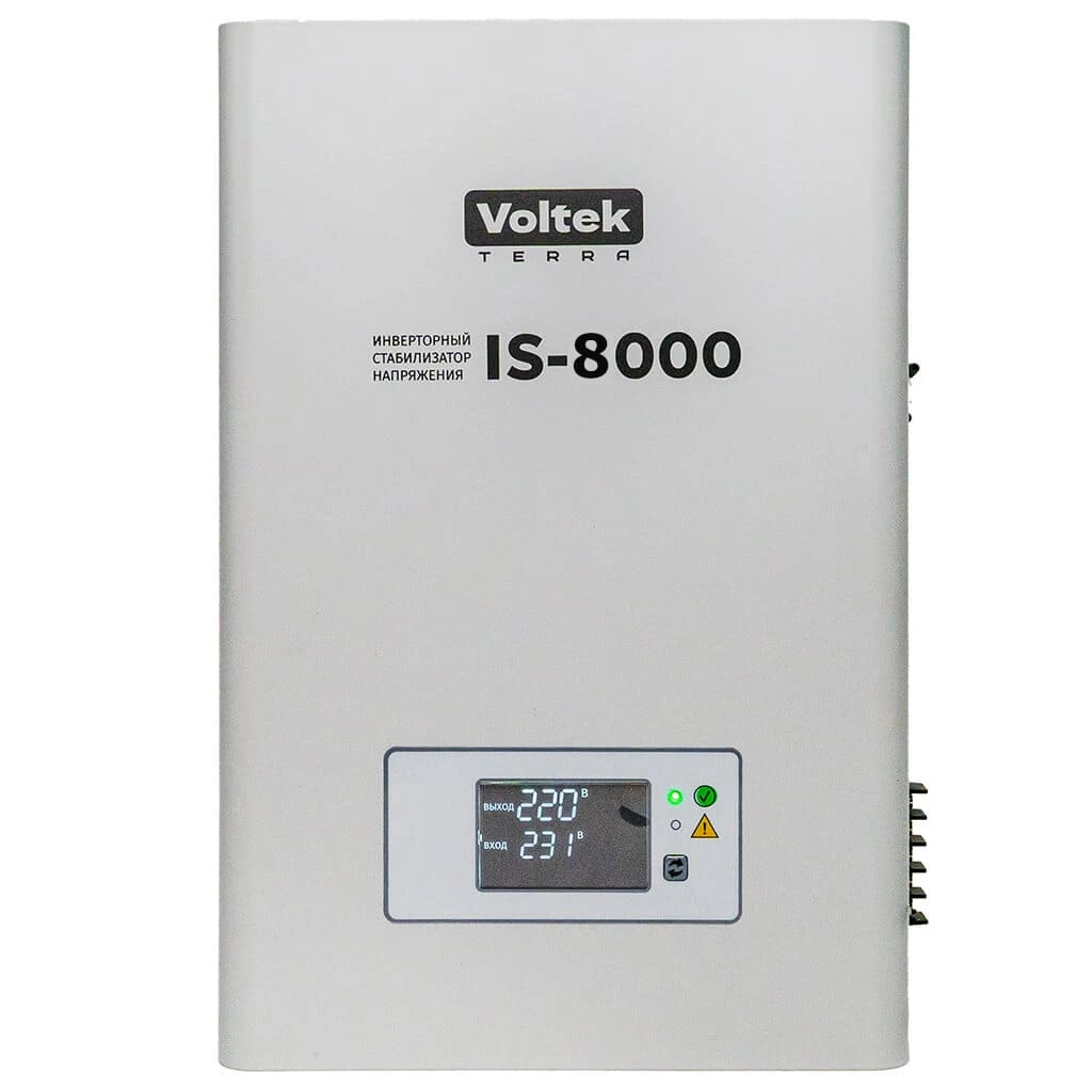 Стабилизатор напряжения Voltek IS предназначен для поддержания стабильного напряжения в однофазных электросетях 220В в соответствии с ГОСТ 13109-97. Стабилизатор обеспечивает защиту от повышенного и пониженного напряжения, электрических помех, высоковольтных скачков и провалов входного напряжения. Стабилизатор оснащен комплексом систем, обеспечивающим надежную защиту как потребителей, так и самого стабилизатора от любых нештатных ситуаций, и рассчитан на непрерывную круглосуточную работу в условиях больших по значению и длительности отклонений напряжения от номинального значения. Количество фаз: однофазный Тип стабилизатора: инверторный Номинальная полная мощность: 8 кВА Номинальная активная мощность: 6.5 кВт Диапазон входных напряжений: 90-310 вольт Номинальное выходное напряжение: 216-224 вольт Погрешность стабилизации напряжения: 220+-2% Диапазон входной частоты: 42-57 Герц Максимальный ток: 38 А Пиковый ток (до 1 сек.): 50 А Энергопотребление без нагрузки: 55 Вт Ток холостого тока: 0,35 А Допустимая перегрузка: 150% не менее 5 сек Искажение формы сигнала: без искажения Форма напряжения на выходе: чистая синусоида Тип электронных ключей: IGBT-транзисторы Индикация: ЖК-дисплей Охлаждение: принудительное Режим работы: непрерывный Защита от короткого замыкания: есть Защита от перегрузки: есть Защита от пониженного напряжения: есть Защита от повышенного напряжения: есть Защита от перегрева: есть Защита от помех: до 2.5 кГц Входной корректор мощности: есть Входной корректор формы напряжения: есть Способ подключения: клеммная колодка КПД: 95% Габаритные размеры: 360x260x100 мм Вес стабилизатора: 8 кг Температурный диапазон работы: -20 C ... +40 C Отличительные черты стабилизаторов Voltek серии IS: Инверторная технология. Технология двойного преобразования напряжения обеспечивает чистую синусоиду, абсолютную защиту от скачков и просадок напряжения. Чистая синусоида. Обеспечивают чистую синусоиду даже при наличии помех во входной линии. Отлично подходит для чувствительной техники. Высокая эффективность. Низкое собственное потребление и высокая энергоотдача. Меньше выделения тепла, меньше потери мощности. Выдерживают высокие пусковые токи. Перегрузочная способность до 150% для устройств с высокими пусковыми токами (насосы, станки, компрессоры и т.п.) Широкий диапазон входных напряжений. Работают в самых проблемных сетях. Стабилизируют напряжение при скачках до 310 В и просадках до 90 В. Высокая точность. Погрешность выходного напряжения всего 2%. Это точнее требований ГОСТ. Подходит для самых требовательных и чувствительных приборов. Полный спектр защитных систем. Защита от аномальных напряжений, перегрева, короткого замыкания и перегрузки. 100% защита как приборов, так и самого стабилизатора Подходят для любой нагрузки. Для бытового или промышленного применения. Одинаково хорошо работают с резистивной, индукционной, емкостной и смешанной нагрузкой По шкале нагрузки можно отслеживать текущую нагрузку на стабилизатор. Не рекомендуется использовать стабилизатор в условиях перегрузки по мощности. Следует помнить, что при пониженном напряжении в электросети эффективная мощность стабилизатора пропорционально снижается. Зависимость эффективной мощности стабилизатора от входного напряжения показана на следующем графике: Стабилизаторы IS-1000, IS-1500, IS-2000, IS-5000, IS-10000 и IS