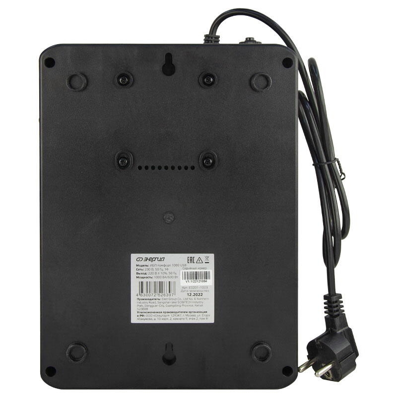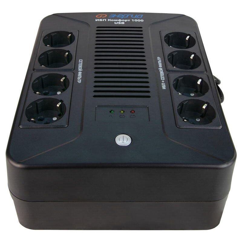 Источник бесперебойного питания Комфорт 1000 USB Энергия служит для защиты от перепадов напряжения и источником питания для компьютеров, ноутбуков, мониторов, модемов, роутеров и другого офисного оборудования. Преимущество данной модели, в отличие предыдущего поколения, имеется возможность отслеживать состояние ИБП через USB-кабель, подключив устройство к компьютеру/ноутбуку, чтобы планировать включение/отключение ИБП (Windows XP/Vista/7/8/10/11). Программу мониторинга можно скачать с сайта производителя (см. инструкцию). Обращаем внимание, что сканеры, лазерные принтеры и прочие энергопотребители высокой мощности (обогреватели, пылесосы, утюги, микроволновки, блендеры) нельзя подключать к ИБП. Нарушение этого правила ведет к перегрузке его, выходу из строя и утраты гарантированного обслуживания. Также не используйте удлинители для подключения нагрузки. Способ установки: Напольный Относительная влажность (%): 90 Тип инвертора: Line-interactive Форма напряжения: Синусоида (от сети) / Модифицированная синусоида (от батареи) Рабочая мощность (ВА): 1000 Пик-фактор: 3:1 Наличие стабилизатора: Встроенный стабилизатор напряжения Наличие аккумулятора: Внутренний 9 АЧ Тип аккумулятора: Свинцово-кислотная необслуживаемая тип AGM Величина постоянного напряжения (В): 12 Количество батарей: 1 x 12В 9Ач Время работы от батарей: 2-11 минут Время зарядки: 6-8 час 90% ёмкости Рабочий диапазон входного напряжения сети (В): 162-296 Выходное напряжение при питании от сети (В): 220 ±10% Выходное напряжение при питании от батарей (В): 220 ±1% Защита от полного разряда батареи: Есть Защита от перезаряда батареи: Есть Защита от перегрузки и короткого замыкания: Есть Время переключения режимов работы: Не более 8 мс Индикация параметров работы: Звуковая индикация / Светодиодный индикатор Подключение к сети: Cетевой шнур с вилкой «Schuko» 2 м Подключение нагрузки к инвертору: 8 розеток Shuko Уровень шума: Не более 45 дб (на расстоянии 1 метр) Температура эксплуатации (°C): 0...+40 Степень защиты (IP): IP20 Вес нетто (кг): 5,85 Габаритные размеры (мм): 205x285x94 Вес брутто (кг): 6,3 Прибор оснащен 8 розетками типа «Shuko», 4 из которых являются стабилизированными, и работают в режиме источника бесперебойного питания и сетевого фильтра, а другие 4 только в режиме сетевого фильтра. Также снабжен функцией «холодный старт», позволяющей включить ИБП при отсутствии напряжения в сети. Прост в эксплуатации, имеет небольшие габариты и вес. Особенности: Широкий диапазон входного напряжения; Наличие 8 евророзеток типа «Shuko»; Интеллектуальное управление зарядом батареи; Универсальная батарея типа AGM, простая замена батареи; Функция «холодный старт»; Автоматическая зарядка батареи при наличии питания в сети; Автоматический предохранитель для защиты от короткого замыкания, перезаряда АКБ, перегрузки и перенапряжения; Встроенный стабилизатор напряжения; Световая и звуковая индикации состояния; Защита модема, роутера, локальной сети - 2 порта RJ45 (вход-выход); Порты и интерфейсы - USB Type-B для мониторинга (Windows XP/Vista/7/8/10/11). В комплект входит кабель USB A-USB B 1,2м