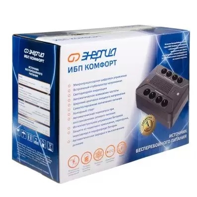 ИБП Комфорт 800 Энергия - это линейноинтерактивный источник бесперебойного питания небольшой мощности со встроенной батареей, который оптимально подходит для защиты персональных компьютеров, мониторов, офисной техники и сопутствующей периферии от основных неполадок с электропитанием. Прибор прост в эксплуатации и оснащен 8 розетками типа «Shuko», 4 из которых являются стабилизированными, и работают в режиме источника бесперебойного питания и сетевого фильтра, а другие 4 только в режиме сетевого фильтра. ИБП Комфорт 800 снабжен функцией «холодный старт», позволяющей включить ИБП при отсутствии напряжения в сети. Тип инвертора: Line-interactive Способ установки: Напольный / Настенный Форма напряжения: Синусоида (от сети) / Модифицированная синусоида (от батареи) Число фаз: Одна Выходное напряжение (В): 220 Рабочая мощность (ВА): 800 Пик-фактор: 3:1 Наличие стабилизатора: Встроенный стабилизатор напряжения Наличие аккумулятора: Внутренний 8 АЧ Тип аккумулятора: Свинцово-кислотная необслуживаемая тип AGM Величина постоянного напряжения (В): 12 Количество батарей: 1 x 12В 8Ач Количество 12 вольтовых аккумуляторов необходимых для работы: 1 Автозапуск: Да Функция заряда аккумулятора: Есть Время работы от батарей: 2-10 минут Время зарядки: 6-8 час 90% ёмкости Рабочий диапазон входного напряжения сети (В): 162-296 Выходное напряжение при питании от сети (В): 220 ±10% Выходное напряжение при питании от батарей (В): 220 ±1% Частота выходного напряжения (Гц): 50 Защита по току: Автоматический выключатель Защита от полного разряда батареи: Есть Защита от перезаряда батареи: Есть Защита от перегрузки и короткого замыкания: Есть Время переключения режимов работы: Не более 8 мс КПД Работа от батарей (%): 88 КПД (%): 95 Индикация параметров работы: Звуковая индикация / Светодиодный индикатор Способ охлаждения: Естественная циркуляция воздуха Подключение к сети: Cетевой шнур с вилкой «Schuko» 2 м Подключение нагрузки к инвертору: 8 розеток Shuko Уровень шума: Не более 45 дб (на расстоянии 1 метр) Температура эксплуатации (°C): 0...+40 Степень защиты, IP: IP20 Относительная влажность: 90% Габаритные размеры (мм): 205х285х94 Вес (кг): 5,5 Особенности: Широкий диапазон входного напряжения; Наличие 8 евророзеток типа «Shuko»; Интеллектуальное управление зарядом батареи; Универсальная батарея типа AGM, простая замена батареи; Функция «холодный старт»; Автоматическая зарядка батареи при наличии питания в сети; Автоматический предохранитель для защиты от короткого замыкания, перезаряда АКБ, перегрузки и перенапряжения; Встроенный стабилизатор напряжения; Световая и звуковая индикации состояния.
