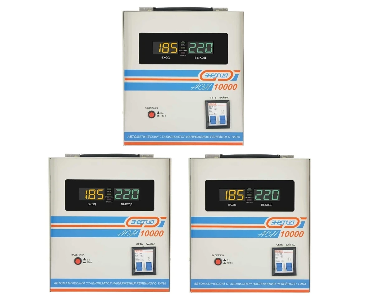Комплект из трех однофазных стабилизаторов напряжения для установки в трехфазную сеть (на три фазы) общей мощностью до 30кВт. Идеальное решение на ввод 15 кВт - с запасом по мощности! Применим по вводной автомам в 25, 32, 40 и 50 Ампер. Стабилизаторы напольного исполнения - удобный монтаж на пол или стеллаж (покупается отдельно), в доме и на улице - под навесом. Также не исключен настенный способ установки с помощью кронштейнов. Недорогой Российский стабилизатор релейного типа с электронным управлением. Отличный вариант для установки в неотапливаемом помещении. Его мощности достаточно, чтобы защитить электроприборы от скачков напряжения в небольшом доме или в квартире. Аппарат может работать при отрицательной температуре до 30 Градусов. У него достаточно широкий диапазон работы с сетевым напряжением от 140 до 260 Вольт рабочий диапазон стабилизации . Предельный диапазон работы находится в границах от 120 до 280 Вольт. Технические характеристики одного блока: Тип напряжения Однофазный Принцип стабилизации Релейный Мощность (кВА) 10 Режим работы Непрерывный Способ установки Напольный Тип охлаждения Воздушное (конвекционное и принудительное) Дисплей Цифровой Индикация Входное напряжение, Выходное напряжение, Сеть, Защита, Задержка, Ток нагрузки Подключение Клеммная колодка Режим "БАЙПАС" Есть Задержка включения 6 секунд, 180 секунд Предельный диапазон входных напряжений (В) 120-280 Рабочий диапазон входных напряжений (В) 140-260 Номинальное выходное напряжение (В) 220 Отклонение выходных напряжений ±8% Время реакции на изменение напряжения (мс) 4 Количество ступеней регулировки 5 Защита от повышенного напряжения, откл. при 280В Защита от пониженного напряжения, откл. при 120В Защита от перегрева трансформатора, откл. при 120 °С Защита от перегрузки по току Автоматический выключатель (ручной возврат в рабочий режим) Степень защиты от внешних воздействий по ГОСТ 14254-96 IP20 Температура эксплуатации (°С) -20...+40 Температура хранения (°С) -40...+45 Относительная влажность (%) 95 КПД при полной нагрузке (%) 98 Габаритные размеры (мм) 360x225x250 Вес (кг) 13.2 Вес брутто (кг) 13.7 Гарантия 12 месяцев Расчетный срок службы 10 лет Применение Для дачи, Для частного дома Особенности: Принцип работы - автотрансформаторный коммутационный; Допускаемая перегрузка - до 110%; Входная цепь - клеммная колодка; Выходная цепь - клеммная колодка; Встроенные средства защиты от косвенного прикосновения - заземлитель; Защитное заземление должно иметь сопротивление не более 4 Ом; Дополнительная функция управления - режим включения обходной цепи; Можно использовать в жилых помещениях; Соответствует всем российским и международным стандартам качества и безопасности; Оснащен интеллектуальной защитой от перегрузок, перегрева, короткого замыкания и других нештатных ситуаций.