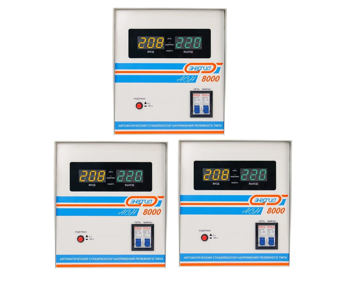 Комплект из трех однофазных стабилизаторов напряжения для установки в трехфазную сеть (на три фазы) общей мощностью до 24 кВт. Идеальное решение на ввод 15 кВт - с запасом по мощности! Стабилизаторы напольного исполнения - удобный монтаж на пол или стеллаж (покупается отдельно), в доме и на улице - под навесом. Также не исключен настенный способ установки с помощью кронштейнов. Стабилизатор Энергия АСН 8000 - это мощное современное устройство нового поколения, которое защитит технику от скачков напряжения в сети. Его мощности достаточно, чтобы защитить электроприборы от скачков напряжения в небольшом доме или в квартире. Аппарат может работать при отрицательной температуре до 30 Градусов. У него достаточно широкий диапазон работы с сетевым напряжением от 140 до 260 Вольт рабочий диапазон стабилизации . Предельный диапазон работы находится в границах от 120 до 280 Вольт. Технические характеристики одного блока: Тип напряжения Однофазный Принцип стабилизации Релейный Мощность (кВА) 8 Режим работы Непрерывный Способ установки Напольный Тип охлаждения Воздушное (конвекционное и принудительное) Дисплей Цифровой Индикация Входное напряжение, Выходное напряжение, Сеть, Защита, Задержка, Ток нагрузки Подключение Клеммная колодка Режим "БАЙПАС" Есть Задержка включения 6 секунд, 180 секунд Предельный диапазон входных напряжений (В) 120-280 Рабочий диапазон входных напряжений (В) 140-260 Номинальное выходное напряжение (В) 220 Отклонение выходных напряжений ±8% Время реакции на изменение напряжения (мс) 4 Количество ступеней регулировки 5 Защита от повышенного напряжения, откл. при 280В Защита от пониженного напряжения, откл. при 120В Защита от перегрева трансформатора, откл. при 120 °С Защита от перегрузки по току Автоматический выключатель (ручной возврат в рабочий режим) Степень защиты от внешних воздействий по ГОСТ 14254-96 IP20 Температура эксплуатации (°С) -20...+40 Температура хранения (°С) -40...+45 Относительная влажность (%) 95 КПД при полной нагрузке (%) 98 Габаритные размеры (мм) 360x225x250 Вес брутто (кг) 12.3 Гарантия 12 месяцев Расчетный срок службы 10 лет Применение Для дачи, Для частного дома