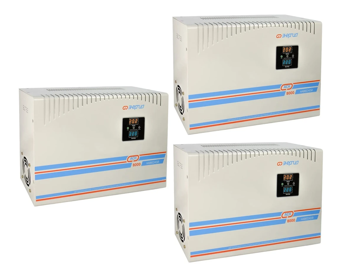 Комплект из трех однофазных стабилизаторов напряжения для установки в трехфазную сеть (на три фазы) общей мощностью до 24 кВт. Идеальное решение на ввод 15 кВт - с запасом по мощности! Стабилизаторы навесного исполнения - удобный монтаж в щит (покупается отдельно), на стену в доме и на улице - под навесом. Также не исключен напольный способ установки. Стабилизатор Энергия АСН 8000 навесной - это мощное современное устройство нового поколения, которое защитит технику от скачков напряжения в сети. Технические характеристики одного блока: Число фаз: Одна Максимальная мощность (ВА): 8000 Максимальный входной ток (А): 49,5 Принцип стабилизации: Релейный Режим работы: Непрерывный Способ установки: Напольный / Настенный Режим "БАЙПАС": Есть Задержка включения: 180 секунд / 6 секунд Рабочий диапазон входных напряжений (В): 140-260 Рабочий диапазон выходных напряжений (В): 202-238 Номинальное выходное напряжение (В): 220 Отклонение выходных напряжений: ±8% Время реакции на изменение напряжения (мс): 10 Защита от повышенного напряжения, откл. при: 280В Защита от пониженного напряжения, откл. при: 120В Защита от перегрева трансформатора, откл. при: 120 °С Защита от перегрузки по току: Автоматический выключатель Температура эксплуатации (°С): -20...+40 Температура хранения (°С): -40...+45 КПД при полной нагрузке (%): 97 Номинальная частота переменного тока (Гц): 50/60 Охлаждение: Естественное и принудительное Степень защиты, IP: IP20 Вес нетто (кг): 14,46 Габаритные размеры (мм): 440x289x149 Вес брутто (кг): 15,14 Прибор поддерживает выходное напряжение 220В при входных колебаниях от 140 до 260В. Он работает по принципу релейной регулировки, то есть автоматически переключает обмотки трансформатора в зависимости от уровня напряжения тока. Официальная гарантия производителя 3 года, а срок службы составляет не менее 10 лет. Особенности: Принцип работы - автотрансформаторный коммутационный; Допускаемая перегрузка - до 110%; Входная цепь - клеммная колодка; Выходная цепь - клеммная колодка; Встроенные средства защиты от косвенного прикосновения - заземлитель; Защитное заземление должно иметь сопротивление не более 4 Ом; Дополнительная функция управления - режим включения обходной цепи; Можно использовать в жилых помещениях; Соответствует всем российским и международным стандартам качества и безопасности; Оснащен интеллектуальной защитой от перегрузок, перегрева, короткого замыкания и других нештатных ситуаций.