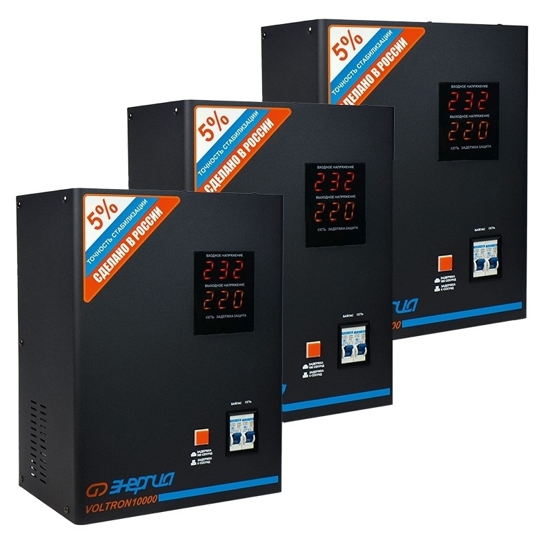 Внимание! В комплект входит входит три однофазных стабилизатора Voltron 10000 (HP) для установки по одному стабилизатору на каждую фазу без учета блока коммутации для трехфазной нагрузки! Тип напряжения: Трехфазный Состав комплекта: 3 блока 220В по 10 кВА Принцип стабилизации: Релейный Мощность (кВА): 10 Режим работы: Непрерывный Способ установки: Напольный / Настенный Тип охлаждения: Воздушное (конвекционное и принудительное) Дисплей: Цифровой Индикация: Входное напряжение / Выходное напряжение / Сеть / Защита / Задержка Подключение: Клеммная колодка Режим "БАЙПАС": Есть Задержка включения: 180 секунд / 6 секунд Предельный диапазон входных напряжений (В): 95-280 Рабочий диапазон входных напряжений (В): 105-265 Номинальное выходное напряжение (В): 220 Отклонение выходных напряжений: ±5% Время реакции на изменение напряжения (мс): 10 Количество ступеней регулировки: 7 Защита от повышенного напряжения, откл. при: 280В Защита от пониженного напряжения, откл. при: 95В Защита от перегрева трансформатора, откл. при: 120 °С Защита от перегрузки по току: Автоматический выключатель Степень защиты от внешних воздействий по ГОСТ 14254-96: IP20 Температура эксплуатации (°С): -30...+40 Температура хранения (°С): -40...+45 Относительная влажность (%): 95 КПД при полной нагрузке (%): 98 Габаритные размеры (мм): 360х270х175 х 3 Вес (кг): 19,4 х 3 Данный вид подключения рекомендуется в случае отсутствия в доме трехфазных потребителей. Выгодней с точки зрения цены. А в случае аварии по одной из фаз (либо пропадании фазы на входе, или выхода из строя одного из стабилизаторов) отключится не вся нагрузка как в случае с трехфазным стабилизатором (по всем трем фазам), а только нагрузка, подключенная к выходу проблемного стабилизатора. Потребители подключенные к оставшимся двум, будут работать.