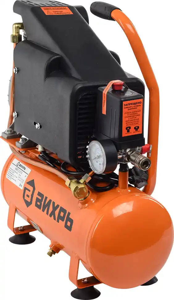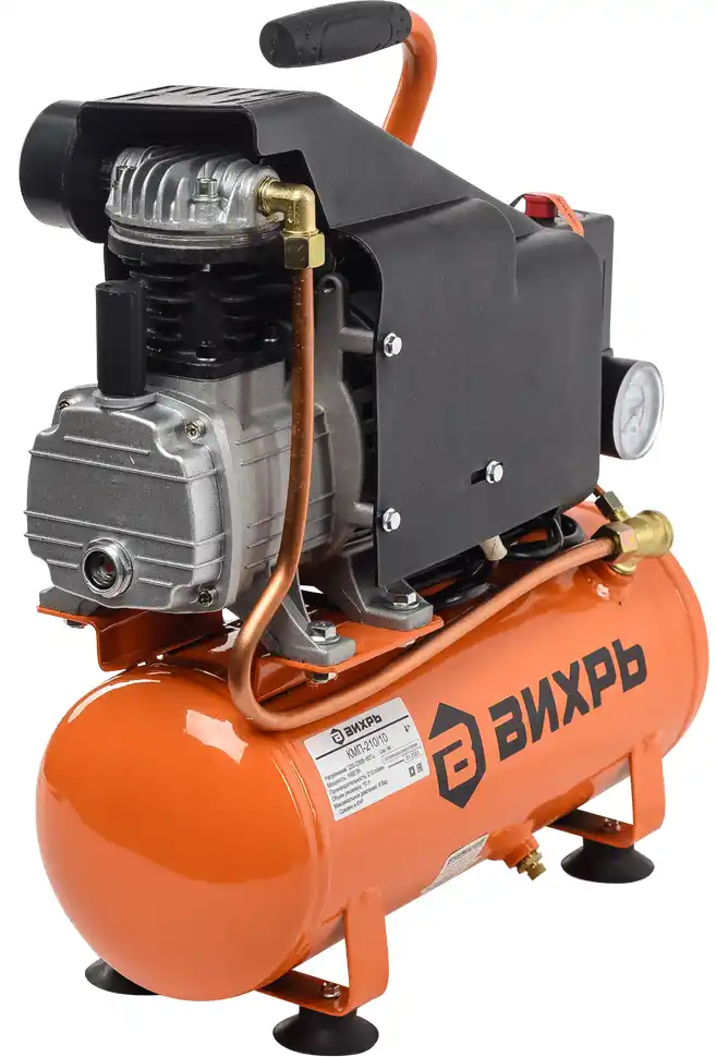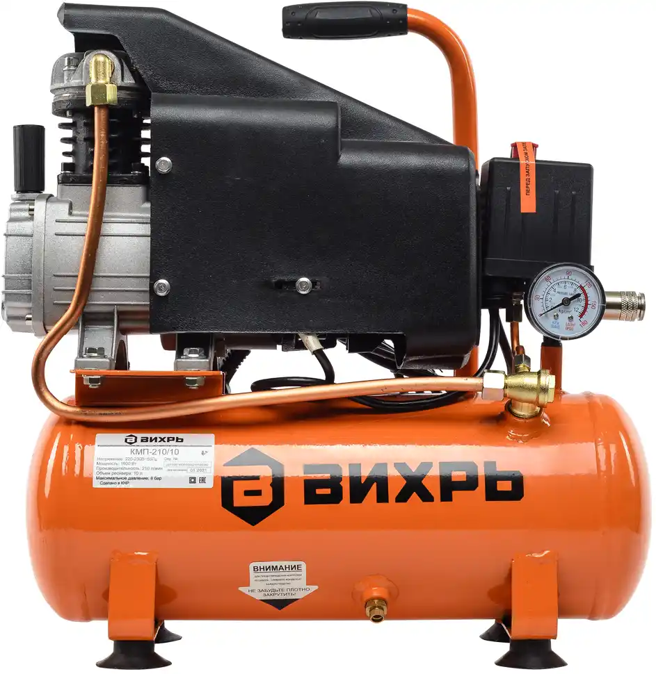 Компрессор ВИХРЬ КМП-210/10 используется для нагнетания сжатого воздуха в различное пневмооборудование в ходе строительно-ремонтных работ в квартире или на даче. Максимальная производительность компрессора 210 литров в минуту, объем ресивера 10 литров. Комплектуется опорными ножками и смазочным маслом. Объем бака, л 10 Обороты, об/мин 2850 Тип двигателя Электрический Давление, бар 8 8 Класс товара Полупрофессиональный Мощность, Вт 1600 Напряжение сети, В 220 Гарантия, мес. 12 Страна бренда Россия Страна производства Китай Вес 13.8 кг Бренд Вихрь Габариты, см 47,5 х 21,0 х 49,0 Производительность, л/мин 210 Вид передачи прямая Особенности: Манометр позволяет контролировать давление в ресивере и на выход. Есть удобная ручка для переноски. Через смотровое окно можно следить за уровнем масла в компрессоре. Электромеханический блок управления давлением в ресивере. Предохранительный механический клапан высокого давления. Дренажный клапан для слива конденсата. Перед каждым пуском проверяйте уровень масла по меткам на окне маслоуказателя картера. Уровень масла должен быть не ниже среднего положения в контрольном окне картера. При необходимости доливайте масло. Категорически запрещается смешивать различные сорта масла