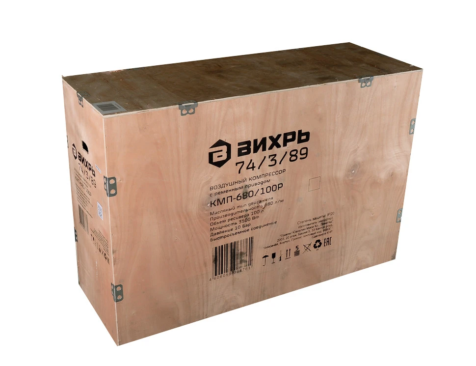 Компрессор Вихрь КМП-680/100Р. Комплектация: Паспорт изделия, Крепежный комплект, Сапун, Смазочное масло для компрессоров, Воздушный фильтр в корпусе Напряжение питающей сети: 220 230 В Частота сети: 50 Гц Мощность: 3500 Вт Максимальная производительность в минуту: 680 л Объем ресивера: 100 л Давление: 10 бар Количество цилиндров: 3 Шт Тип компрессора: Поршневой Вид передачи: Ременная Гарантия: 1 год. Вес, кг: 86.87 кг Габариты упаковки: 722х722х722 мм