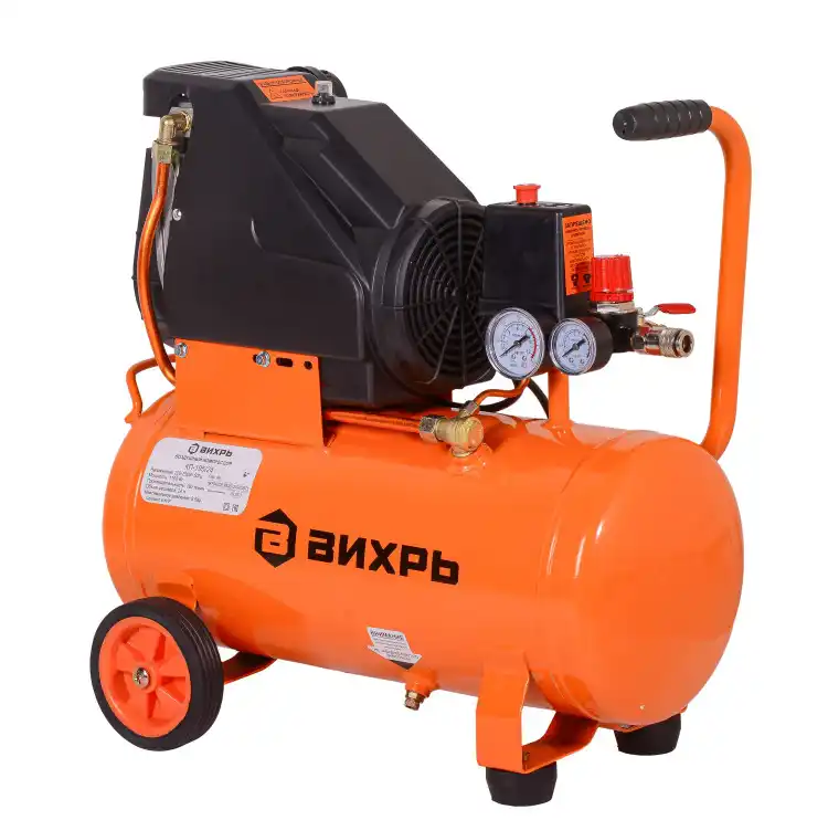 Поршневой безмасляный компрессор Вихрь КП-195/24 с ресивером обеспечит нагнетание сжатого воздуха для надежной и бесперебойной работы пневмоинструмента и оборудования. Мощность, Вт 1100 Напряжение сети, В 220 Вес: 19.172 кг Бренд: Вихрь Объем ресивера, л: 24 Вид передачи: прямая Количество цилиндров: 1 Максимальная производительность, л/мин: 195 Габариты упаковки: 0.436 × 0.436 × 0.436 м Тип компрессора: поршневой, безмасляный Номинальное давление компрессора: 8 Бар Рабочий диапазон температуры окружающей среды, °C: +5...+35 Поршневая модель с прямым приводом способна работать с производительностью до 195 л/мин и подавать сжатый воздух под давлением 8 бар. Преимуществом компрессора является наличие ресивера емкостью 24 л, в котором накапливается сжатый воздух. Благодаря возможности использовать резервный запас, сжатый воздух подается в пневмоинструмент более плавно и равномерно, исключаются скачки давления и перебои в работе, снижается расход электроэнергии. Использование безмасляного агрегата с воздушным фильтром обеспечивает чистоту подаваемого воздуха, без примесей частичек масла. Такой вариант актуален в автомастерских, где производится покраска автомобилей, на пищевых и других предприятиях. В конструкцию также входят реле и регулятор давления, предохранительный, обратный, сливной клапаны, манометр. Устройство имеет термозащиту, антивибрационные накладки на ножках, 2 колеса для удобства перемещения, разъемы EURO-рапид для подключения большинства видов пневматического оборудования. Низкий уровень шума позволяет использовать компрессорный агрегат вблизи жилых домов и в многолюдных местах.