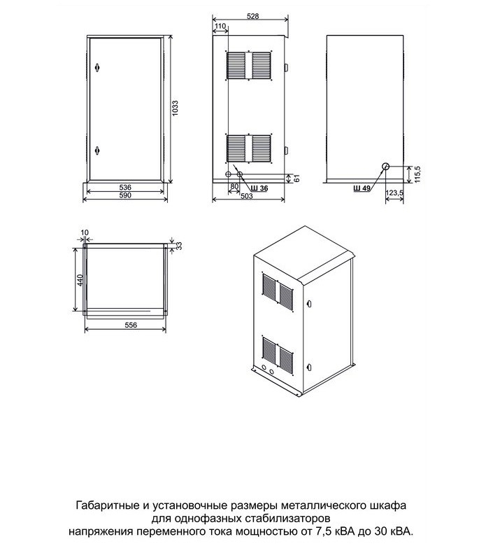 Металлический шкаф LIDER Ш1/7,5-30 для однофазных стабилизаторов Габариты, мм (ШхГхВ: 590х528х1033 Масса, не более, кг: 25 Класс защиты: IP32 Шкаф представляет собой металлическую конструкцию прямоугольной формы напольного исполнения. Шкаф предназначен для размещения стабилизатора напряжения переменного тока мощностью: от 7500 ВА до 30000 ВА серии SQ-I; от 15000 ВА до 30000 ВА серии W; SQ-D; от 10000 ВА до 12000 ВА серии W-SD; от 5000 ВА до 20000 ВА серии SQ-E; от 5000 ВА до 7500 ВА серии SQ-C; от 5000 ВА до 30000 ВА серии SQ-L.