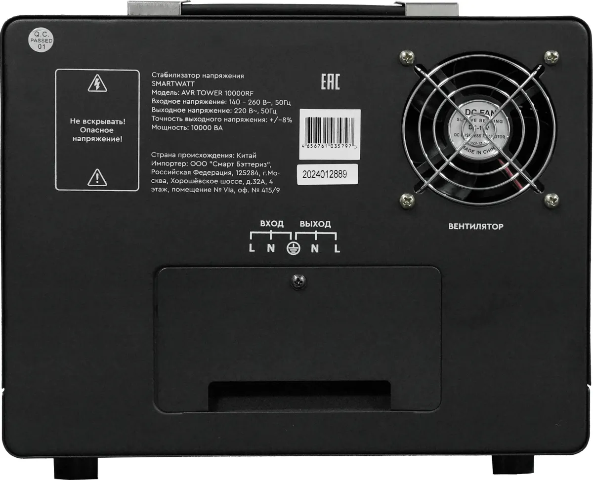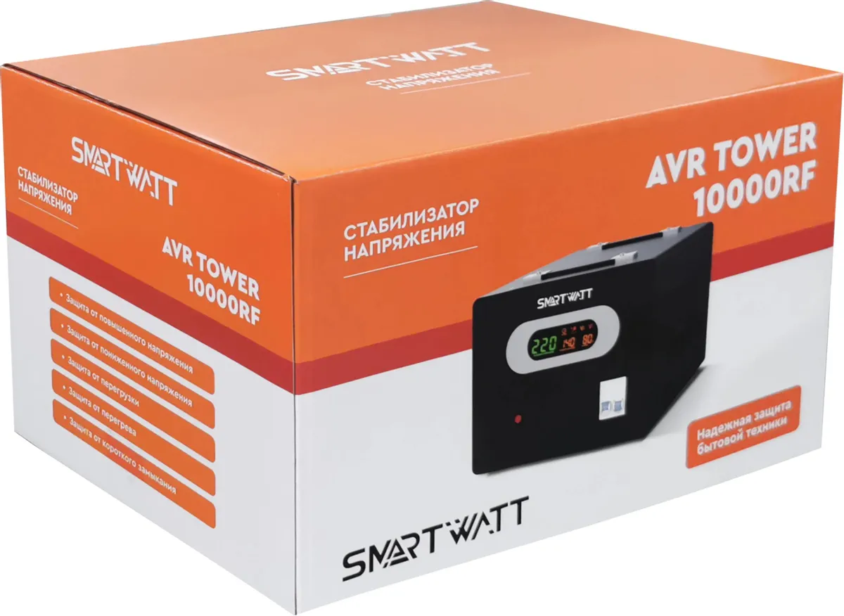Напольный стабилизатор напряжения SMARTWATT AVR TOWER 10000RF предназначен для защиты бытовой техники, электроинструмента и прочего оборудования. Отличается удобством в использовании и надежной защитой. Среди особенностей модели релейное переключение при помощи микропроцессора, функция «ZeroCross», задержка на включение, встроенный байпас, расширенный дисплей индикации, напольный корпус. Категория: Стабилизаторы SMARTWATT серии TOWER; Производитель: SMARTWATT; Тип товара: Стабилизатор напряжения; Принцип работы: Релейный; Модельный ряд: TOWER; Напряжение: Однофазный; Мощность: 10000 ВА; Рабочий диапазон: 140 - 260 Вольт; Время отклика: 20 мс; Точность: 220 Вольт ± 8 %; Температура эксплуатации: от -10 до +40 °C; Установка: Напольный; Родина бренда / страна производства: Россия / Китай Габариты: 290х220х415; Вес изделия: 16.60 кг; Стабилизатор серии TOWER отличается удобством в использовании и надежной защитой 1) При изменении напряжения сети микропроцессорное управление и алгоритм переключений увеличивают скорость реакции и обеспечивают защиту нагрузки. 2) Функция «ZeroCross» выполняет переключение ступеней в момент протекания нулевого тока через реле. 3) Стабилизатор оснащен функцией задержки включения для защиты компрессоров, холодильников, систем кондиционирования и других устройств. 4) Встроенный байпас (в моделях более 3кВА) для удобства обслуживания. 5) ЖК-дисплей с индикацией входноговыходного напряжения, уровня нагрузки и аварийных ситуаций. 6) Система управления вентилятором