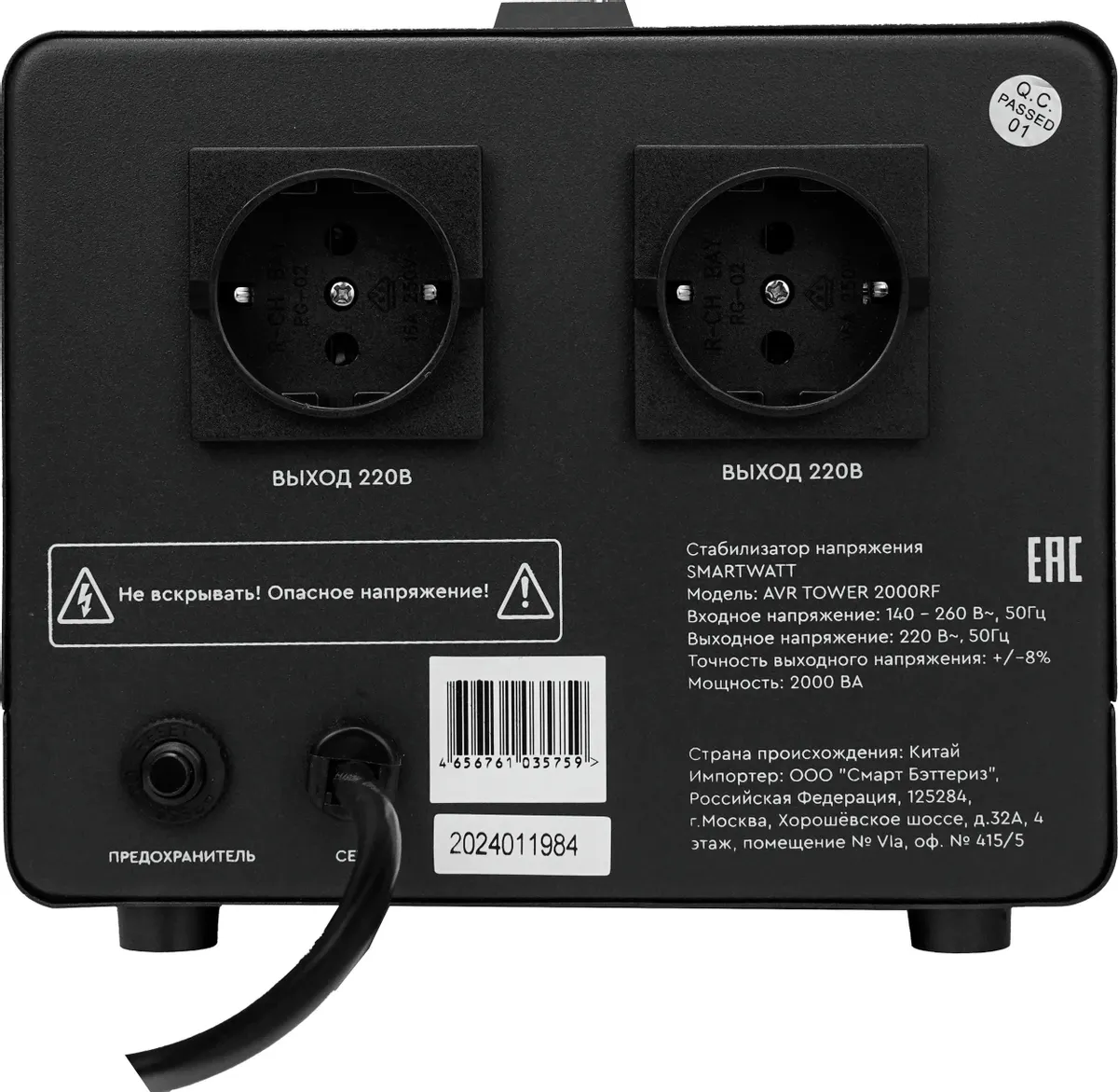 Напольный стабилизатор напряжения SMARTWATT AVR TOWER 2000RF предназначен для защиты бытовой техники, электроинструмента и прочего оборудования. Отличается удобством в использовании и надежной защитой. Среди особенностей модели релейное переключение при помощи микропроцессора, функция «ZeroCross», задержка на включение, расширенный дисплей индикации, напольный корпус. Категория: Стабилизаторы SMARTWATT серии TOWER; Производитель: SMARTWATT; Тип товара: Стабилизатор напряжения; Принцип работы: Релейный; Модельный ряд: TOWER; Напряжение: Однофазный; Мощность: 2000 ВА; Рабочий диапазон: 140 - 260 Вольт; Время отклика: 20 мс; Точность: 220 Вольт ± 8 %; Температура эксплуатации: от -10 до +40 °C; Установка: Напольный; Родина бренда / страна производства: Россия / Китай Габариты: 190х150х235; Вес изделия: 4.44 кг; Стабилизатор серии TOWER отличается удобством в использовании и надежной защитой 1) При изменении напряжения сети микропроцессорное управление и алгоритм переключений увеличивают скорость реакции и обеспечивают защиту нагрузки. 2) Функция «ZeroCross» выполняет переключение ступеней в момент протекания нулевого тока через реле. 3) Стабилизатор оснащен функцией задержки включения для защиты компрессоров, холодильников, систем кондиционирования и других устройств. 4) Встроенный байпас (в моделях более 3кВА) для удобства обслуживания. 5) ЖК-дисплей с индикацией входноговыходного напряжения, уровня нагрузки и аварийных ситуаций. 6) Система управления вентилятором