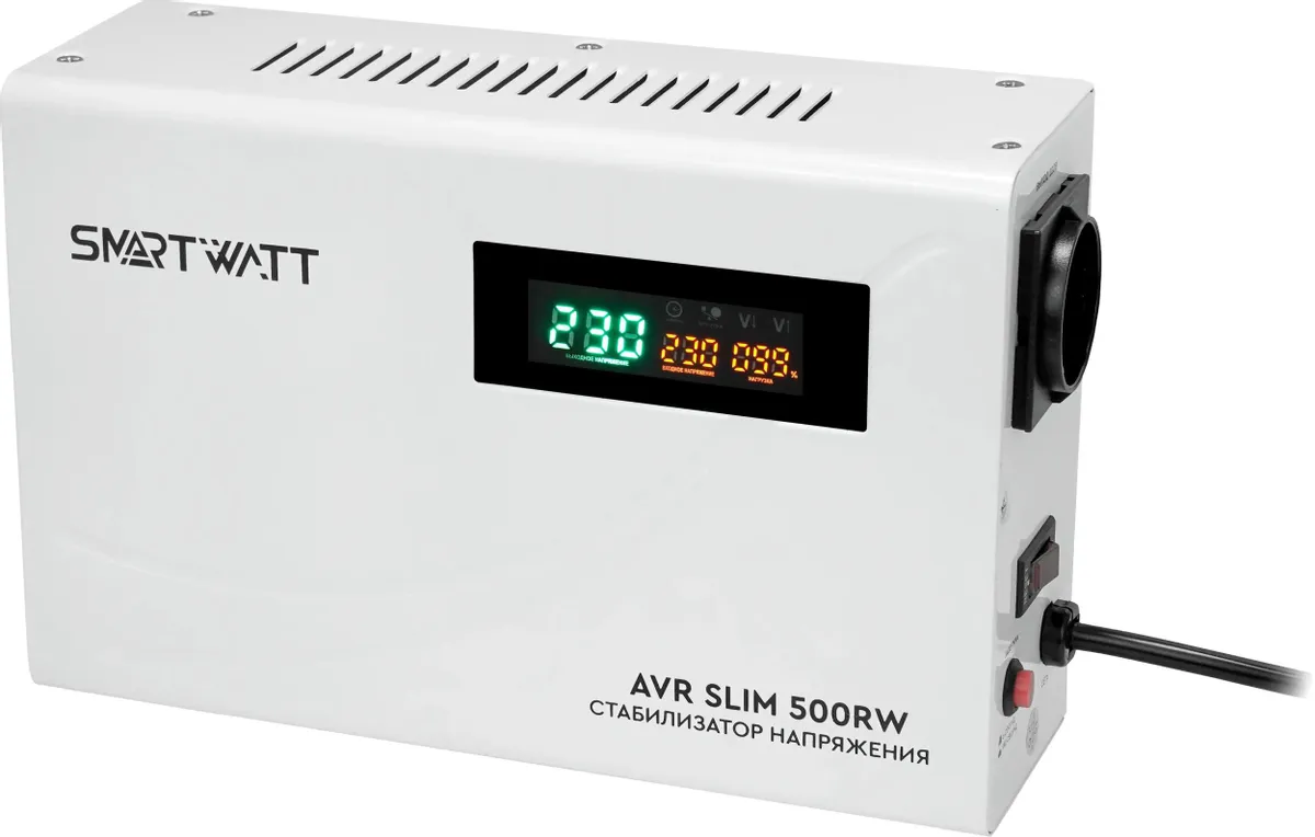 Настенный стабилизатор напряжения SMARTWATT AVR SLIM 500RW имеет удобный конструктив и улучшенные технические характеристики. Среди особенностей модели стабилизация напряжения от 100В, компактный плоский корпус, релейное переключение при помощи микропроцессора, функция «ZeroCross», задержка на включения, расширенный дисплей индикации, возможность напольного и настенного размещения. Категория: Стабилизаторы SMARTWATT серии AVR SLIM; Производитель: SMARTWATT; Тип товара: Стабилизатор напряжения; Принцип работы: Релейный; Модельный ряд: SLIM; Напряжение: Однофазный; Мощность: 500 ВА; Рабочий диапазон: 100 - 260 Вольт; Время отклика: 20 мс; Точность: 220 Вольт ± 8 %; Температура эксплуатации: от -10 до +40 °C; Установка: Настенный; Родина бренда / страна производства: Россия / Китай Габариты: 260х170х90; Вес изделия: 2.53 кг; Стабилизаторы серии SLIM отличается удобным конструктивом и улучшенными техническими характеристиками 1) За счет плоского тороидального трансформатора корпус стабилизатора имеет минимальную толщину для удобного размещения на вертикальной поверхности.